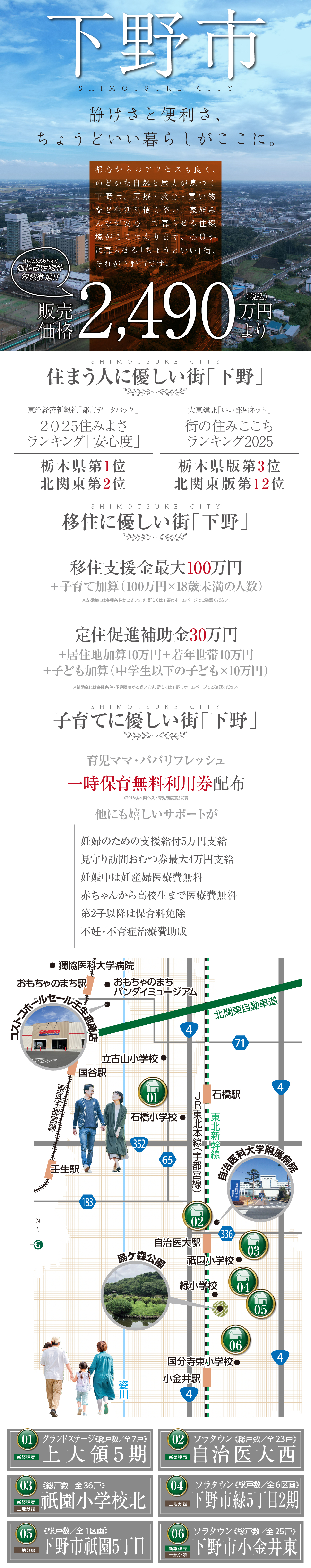 下野市エリア特集 8件の分譲地、46件のプランが見つかりました。 〈WEBご来場予約プレゼント〉2026年2月15日(日)までに当社ホームページより下記対象会場へご来場予約いただいた方が対象です。※アンケートにご回答いただいた、グランディハウスの分譲地を初めてご見学された、住宅購入予定のある新規のご家族が対象です。※数に限りがありますので各プレゼントは1家族1回とさせていただきます。〈ご成約プレゼント〉2026年2月15日(日)までに対象物件をご成約いただいたお客様が対象です。※対象号棟は分譲地により異なります。価格改定物件は対象外となります。※プレゼントは当社指定品の中からお選びいただけます。※ご成約後に解約された場合は本プレゼントの適用対象外となります。※その他のサービスとの併用はできません。※掲載の画像はすべてイメージです。※詳しくは当社スタッフにお尋ねください。 エリア絞込: すべて 下野市 すべての物件にチェックを入れる すべてチェック 物件をくらべる まとめて資料請求する 0件の分譲地 物件をくらべる(5件まで) まとめて資料請求する(5件まで) 価格改定 モデルハウス 下野市 小金井 ソラタウン自治医大西 お気に入り登録人数7人 販売戸数: 6戸 販売価格: 2,490万円 (税込) 〜 7,9〜11,16,17号棟!子育てグリーン対象 11号棟 価格改定|2,490万円 100万円相当の選べるオプションプレゼント!! 【太陽光発電システム ✕ ZEH ✕ おひさまエコキュート 採用】 ◆JR「自治医大」駅 約1,450m|国道4号線へスムーズアクセス ◆全23邸の大型分譲地 来場予約 資料請求(無料) 電話相談 お問い合わせ グランディハウス 本社営業部 宇都宮市大通り4丁目3番18号 0120267777(発信する) 閉じる 分譲地詳細を見る 新着 価格改定 下野市 薬師寺 ソラタウン祇園小学校北 お気に入り登録人数1人 販売戸数: 13戸 販売価格: 3,480万円 (税込) 〜 14号棟 価格改定|3,480万円 13〜17号棟!子育てグリーン対象 15,16,17号棟対象 100万円相当の選べるオプションプレゼント!! 【ZEH住宅 × 長期優良住宅認定】 ◆全36邸の大型分譲 ◆JR「自治医大」駅・祇園小学校・かましん 徒歩圏内 ◆国土交通大臣認定耐力壁「K3」制震ダンパー搭載 (祇園の「祇」はネに氏です。) 来場予約 資料請求(無料) 電話相談 お問い合わせ グランディハウス 本社営業部 宇都宮市大通り4丁目3番18号 0120267777(発信する) 閉じる 分譲地詳細を見る 価格改定 モデルハウス 下野市 柴 ソラタウン下野市小金井東 〜小金井駅東〜 お気に入り登録人数2人 販売戸数: 7戸 販売価格: 2,999万円 (税込) 〜 12,14号棟!子育てグリーン対象 全棟長期優良住宅×60年サポートシステム 19号棟 価格改定|2,999万円 【長期優良住宅認定 ✕ ZEH ✕ おひさまエコキュート 採用】 ライフスタイルで住まいの環境を選べる全25邸の大型分譲地 〈プライベート街区〉分譲地の奥に広がった、視線を気にせず過ごせる落ち着いた環境。 〈フロント街区〉分譲地入口付近に位置し、出入りがスムーズ。アクティブなご家族におすすめ(建築条件付土地分譲中) ◆JR「小金井」駅まで自転車9分(※実測)|「国分寺東小学校」まで徒歩12分 来場予約 資料請求(無料) 電話相談 お問い合わせ グランディハウス 本社営業部 宇都宮市大通り4丁目3番18号 0120267777(発信する) 閉じる 分譲地詳細を見る 新着 価格改定 モデルハウス 下野市 上大領 グランドステージ上大領5期 お気に入り登録人数人 販売戸数: 6戸 販売価格: 3,199万円 (税込) 〜 1〜5号棟!子育てグリーン対象 2号棟 価格改定|3,199万円 【長期優良住宅認定 ✕ K3制震ダンパー採用】 ◆敷地面積最大94坪|最大4台分の駐車スペースを確保 ◆モノトーンを基調に色数を抑え、シックな雰囲気の街並みデザイン 来場予約 資料請求(無料) 電話相談 お問い合わせ グランディハウス 本社営業部 宇都宮市大通り4丁目3番18号 0120267777(発信する) 閉じる 分譲地詳細を見る 価格改定 土地分譲 下野市 緑5丁目 ソラタウン下野市緑5丁目2期【建築条件付土地分譲】 お気に入り登録人数2人 販売区画数: 1区画 販売価格: 1,995万円 価格改定 4号地 1,995万円 ◆「緑小学校」・「南河内中学校」まで徒歩10分の安心ロケーション ◆自分好みのマイホーム実現、注文住宅用地 来場予約 資料請求(無料) 電話相談 お問い合わせ オーダー建築部 オーダー営業課 宇都宮市インターパーク5丁目1番21 0120303360(発信する) 閉じる 分譲地詳細を見る 価格改定 土地分譲 下野市 薬師寺 ソラタウン祇園小学校北【建築条件付土地分譲】 お気に入り登録人数1人 販売区画数: 4区画 販売価格: 1,295.6万円 〜 4号地 価格改定|1,295.6万円 ◆JR宇都宮線「自治医大」駅より徒歩10〜12分 ◆祇園小学校まで徒歩4分圏内と、毎日の登下校も安心のロケーション (祇園の「祇」はネに氏です。) ◆自分好みのマイホーム実現、注文住宅用地 来場予約 資料請求(無料) 電話相談 お問い合わせ オーダー建築部 オーダー営業課 宇都宮市インターパーク5丁目1番21 0120303360(発信する) 閉じる 分譲地詳細を見る 価格改定 土地分譲 下野市 柴 ソラタウ