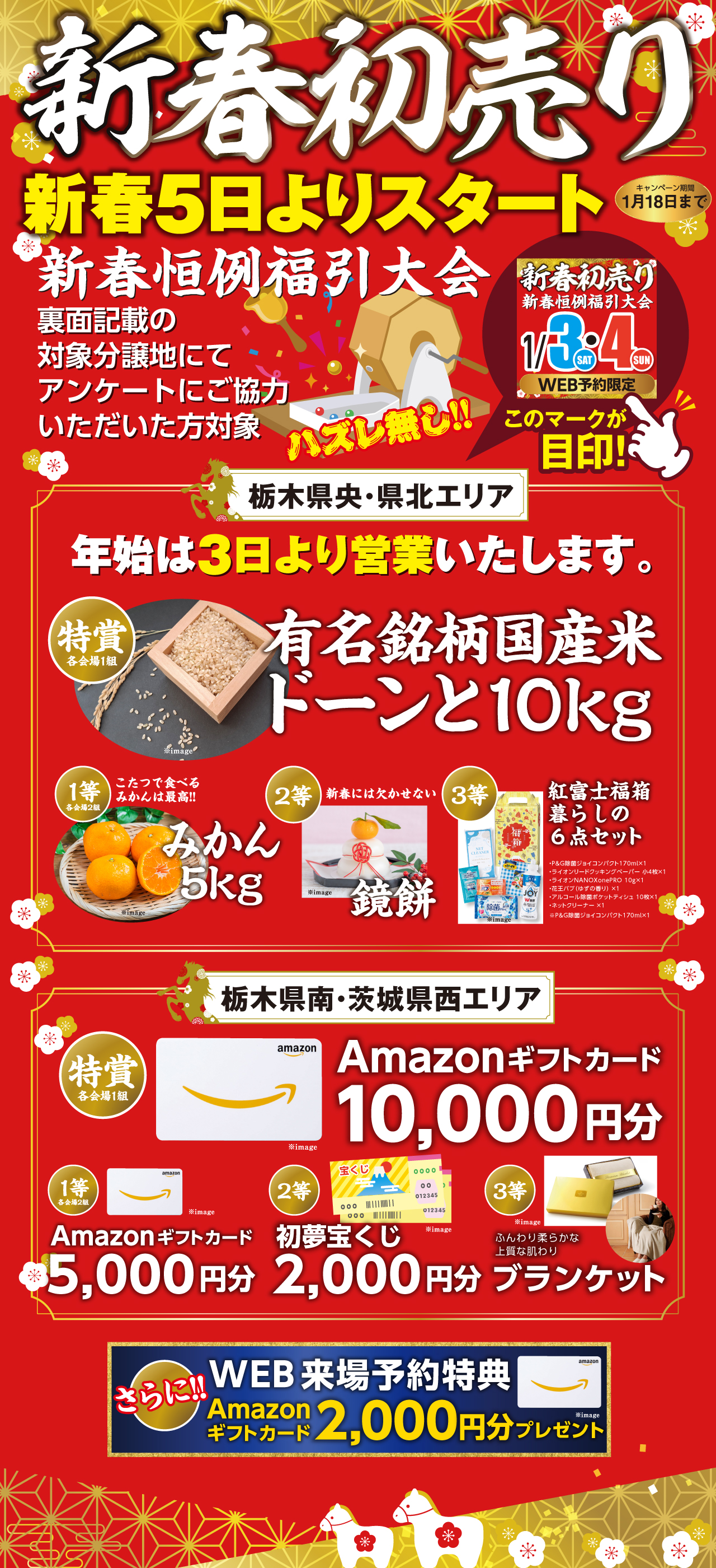 新春初売り福引大会 70件の分譲地、282件のプランが見つかりました。 【新春恒例福引大会】※2026年1月18日までに対象分譲地にお越しいただくことが条件となります。※1/3,4は対象物件をWEBからの事前予約限定となります。※抽選は1家族様1回となります。※アンケートにお答えいただいた、住宅購入予定のある、グランディハウスの分譲地を初めてご見学された新規のご家族が対象です。※プレゼントは後日ご自宅へのお届けとなり、授受トラブル防止のため手渡しのみとなります。郵送または弊社スタッフによる投函でのお渡しは行っておりません。※数に限りがありますので各プレゼントは1家族1回とさせていただきます。※商品が無くなり次第終了となります。※その他のプレゼントとの併用は出来ません。※商品が変更となる場合がございますので、予めご了承ください。※画像はイメージです。※詳しくは当社スタッフにお尋ねください。※WEBご来場予約特典はグランディハウス(株)による提供です。本キャンペーンについてのお問い合わせはAmazonではお受けしておりません。グランディハウス事務局ad@grandy.co.jpまでお願いいたします。※Amazon、Amazon.co.jpおよびそのロゴはAmazon.com.inc.またはその関連会社の商標です。 エリア絞込: すべて 宇都宮市 栃木市 佐野市 鹿沼市 小山市 真岡市 大田原市 那須塩原市 さくら市 下野市 下都賀郡壬生町 下都賀郡野木町 すべての物件にチェックを入れる すべてチェック 物件をくらべる まとめて資料請求する 0件の分譲地 物件をくらべる(5件まで) まとめて資料請求する(5件まで) 価格改定 モデルハウス 宇都宮市 越戸町 越戸アトレア【モデルハウス街区】 お気に入り登録人数8人 販売戸数: 2戸 販売価格: 3,680万円 (税込) 〜 ご好評頂いたオーダー提案型モデルハウスを家具付にて販売 <27号棟>2階建モデル_価格改定3,980万円 <28号棟>平屋モデル_価格改定3,680万円 ◆子育て家族に嬉しい、時短発想!2階建プラン ◆1人でも2人暮らしにもちょうどいい!平屋プラン ◆先進の設備仕様を採用した、全39邸の大型分譲地内特設モデルギャラリー ◆泉が丘小・中学校区 来場予約 資料請求(無料) 電話相談 お問い合わせ グランディハウス 宇都宮東支店 宇都宮市中今泉3丁目1-37 0120842233(発信する) 閉じる 分譲地詳細を見る 小山市 東城南 ソラタウン小山市東城南3丁目2期 お気に入り登録人数2人 販売戸数: 2戸 販売価格: 4,270万円 (税込) 「ウルトラファインバブルスイゲン」採用 「東城南小学校」まで徒歩4分 【長期優良住宅認定 ✕ ZEH ✕ おひさまエコキュート ✕ K3制震ダンパー採用】 さらに建物内すべての水に、ウルトラファインバブルを 行き渡らせる「スイゲン」を採用。 来場予約 資料請求(無料) 電話相談 お問い合わせ グランディハウス 県南支社 小山市東城南5丁目1番地9 0120785060(発信する) 閉じる 分譲地詳細を見る 新着 那須塩原市 東三島三丁目 ナチュラルグレイス那須塩原市東三島3丁目5期 お気に入り登録人数1人 販売戸数: 8戸 販売価格: 2,930万円 (税込) 〜 最高等級の耐震性能+制震ダンパーK3標準搭載! 60年保証+60年サポート! 住宅設備10年保証制度あり! ◆小・中学校、ニトリ、フードマーケットオータニまで徒歩圏内 ◆オール電化&ZEH水準の断熱性能・省エネルギー性能の住まい 来場予約 資料請求(無料) 電話相談 お問い合わせ グランディハウス 県北支店 矢板市鹿島町1番52号 0120002138(発信する) 閉じる 分譲地詳細を見る 新着 宇都宮市 簗瀬3丁目 ソラタウン簗瀬3丁目8期 お気に入り登録人数5人 販売戸数: 2戸 販売価格: 4,100万円 (税込) 〜 JR「宇都宮」駅 約1,500m ZEH住宅 × 長期優良住宅認定 ◆静和幼稚園、簗瀬小学校 徒歩13分圏内、たいらや 徒歩10分 ◆通り抜け可能なゆとりある6mの街区内道路 ◆国土交通大臣認定耐力壁「K3」制震ダンパー搭載 来場予約 資料請求(無料) 電話相談 お問い合わせ グランディハウス 宇都宮東支店 宇都宮市中今泉3丁目1-37 0120842233(発信する) 閉じる 分譲地詳細を見る モデルハウス 小山市 雨ケ谷 グランドステージ城南の森7期 お気に入り登録人数11人 販売戸数: 6戸 販売価格: 2,695万円 (税込) 〜 月々62863円~※ 敷地面積最大261㎡・ZEH水準の断熱性能で高機能安心住宅 〈3号棟のみZEH住宅〉 ◆長期優良住宅認定(第3次街区) ◆通り抜けのできない、住まう方専用の街区内道路で繋がる街並み ◆「ヨークベニマル」「無印良品」など、商業施設エリアが身近な暮らし ◆玄関ドア電子キー/電動シャッター標準装備 来場予約 資料請求(無料) 電話相談 お問い合わせ グランディハウス 県南支社 小山市東城南5丁目1番地9 0120785060(発信する) 閉じる 分譲地詳細を見る 価格改定 モデルハウス 那須塩原市 西新町 グランドステージ那須塩原市西新町 お気に入り登録人数3人 販売戸数: 3戸 販売価格: 2,498万円 (税込) 〜 3号棟 価格改定|2,498万円 月々58,268円(ボーナス払いなし) 60年保証+60年サポート! 住宅設備10年保証制度あり! ◆最大敷地面積73坪超、全8邸のゆとりと街並み ◆ZEH水準の断熱・省エネル