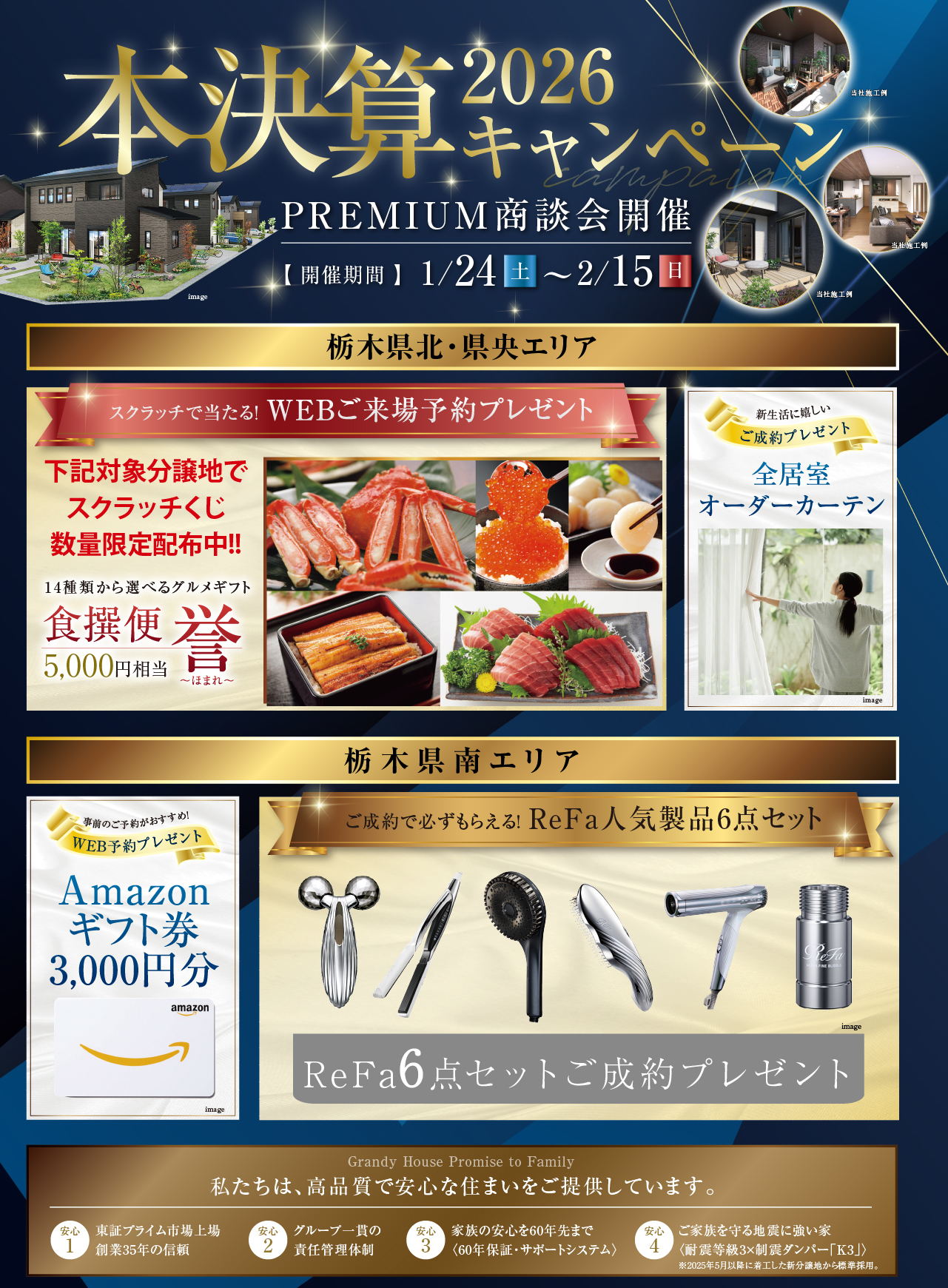 本決算キャンペーン 50件の分譲地、230件のプランが見つかりました。 〈WEBご来場予約プレゼント〉2026年2月15日(日)までに当社ホームページより下記対象会場へご来場予約いただいた方が対象です。※アンケートにご回答いただいた、グランディハウスの分譲地を初めてご見学された、住宅購入予定のある新規のご家族が対象です。※数に限りがありますので各プレゼントは1家族1回とさせていただきます。〈ご成約プレゼント〉2026年2月15日(日)までに対象物件をご成約いただいたお客様が対象です。※対象号棟は分譲地により異なります。価格改定物件は対象外となります。※プレゼントは当社指定品の中からお選びいただけます。※ご成約後に解約された場合は本プレゼントの適用対象外となります。※その他のサービスとの併用はできません。※掲載の画像はすべてイメージです。※詳しくは当社スタッフにお尋ねください。 エリア絞込: すべて 宇都宮市 栃木市 佐野市 鹿沼市 小山市 真岡市 大田原市 那須塩原市 さくら市 下野市 下都賀郡壬生町 下都賀郡野木町 すべての物件にチェックを入れる すべてチェック 物件をくらべる まとめて資料請求する 0件の分譲地 物件をくらべる(5件まで) まとめて資料請求する(5件まで) 価格改定 モデルハウス 宇都宮市 越戸町 越戸アトレア お気に入り登録人数人 販売戸数: 5戸 販売価格: 3,480万円 (税込) 〜 泉が丘小・中学校学区 100万円相当の選べるオプションプレゼント!! <28号棟>平屋モデル_価格改定3,480万円 【長期優良住宅認定 ✕ K3制震ダンパー採用】 ◆越戸通りそば39邸の大型プロジェクト|新設の街区公園を中心に描く穏やかな街並み ◆越戸ショッピングセンターが徒歩6〜9分 来場予約 資料請求(無料) 電話相談 お問い合わせ グランディハウス 宇都宮東支店 宇都宮市中今泉3丁目1-37 0120842233(発信する) 閉じる 分譲地詳細を見る 新着 モデルハウス 佐野市 堀米町 ソラタウン佐野市堀米町11期 お気に入り登録人数5人 販売戸数: 10戸 販売価格: 2,695万円 (税込) 〜 月々62,863円〜※ 2つのモデルハウス公開・太陽光、家具付販売 <子育て世帯に優しい全28区画> ◆住まう人だけが使う街区内道路で、街にゆとりと安心を。 ◆「城北小学校」「北中学校」まで徒歩14分圏内。毎日の通学も安心。 ◆「佐野市こどもの国」「イオンタウン」など、暮らしを支える施設もすぐそば。 ◆オール電化&ZEH+おひさまエコキュート採用の住まい。 来場予約 資料請求(無料) 電話相談 お問い合わせ グランディハウス 両毛支店 佐野市茂呂山町3番地11 0120651388(発信する) 閉じる 分譲地詳細を見る 那須塩原市 東三島三丁目 ナチュラルグレイス那須塩原市東三島3丁目5期 お気に入り登録人数3人 販売戸数: 8戸 販売価格: 2,930万円 (税込) 〜 【長期優良住宅認定 ✕ K3制震ダンパー採用】 60年保証+60年サポート! 住宅設備10年保証制度あり! ◆小・中学校、ニトリ、フードマーケットオータニまで徒歩圏内 ◆オール電化&ZEH水準の断熱性能・省エネルギー性能の住まい 来場予約 資料請求(無料) 電話相談 お問い合わせ グランディハウス 県北支店 矢板市鹿島町1番52号 0120002138(発信する) 閉じる 分譲地詳細を見る 宇都宮市 中久保2丁目 ソラタウン中久保2丁目3期 お気に入り登録人数1人 販売戸数: 2戸 販売価格: 4,200万円 (税込) LRT「陽東3丁目」停留場まで徒歩5分 ZEH住宅 × 長期優良住宅認定 ◆全棟、陽光あふれる開放的な吹抜けLDKを採用 ◆国土交通大臣認定耐力壁「K3」制震ダンパー搭載 来場予約 資料請求(無料) 電話相談 お問い合わせ グランディハウス 宇都宮東支店 宇都宮市中今泉3丁目1-37 0120842233(発信する) 閉じる 分譲地詳細を見る 新着 栃木市 平柳町 グランドステージ栃木市平柳町3丁目5期 お気に入り登録人数人 販売戸数: 4戸 販売価格: 2,890万円 (税込) 〜 【長期優良住宅×60年サポート×高性能ZEH断熱水準】 駐車4台可能なゆとりのプランあり 【長期優良住宅認定 ✕ K3制震ダンパー採用】 ◆多彩な外壁材を巧みに使い分け描く、個性ある外観デザイン ◆家事効率をアップさせる水回りの動線や、暮らしの動線に沿って配置した収納プラン ◆暮らしの幅が広がる交通利便|目的によって選べる豊富な商業施設 ◆「新栃木」駅 徒歩15〜16分 来場予約 資料請求(無料) 電話相談 お問い合わせ グランディハウス 県南支社 小山市東城南5丁目1番地9 0120785060(発信する) 閉じる 分譲地詳細を見る 価格改定 那須塩原市 豊浦町 グランプレミアム那須塩原市豊浦町 お気に入り登録人数19人 販売戸数: 1戸 販売価格: 2,680万円 (税込) 13号棟 価格改定|2,680万円 おかげさまであと1棟! 85坪超のゆとりある敷地! 60年保証+60年サポート! 住宅設備10年保証制度あり! ◆回廊をイメージさせる街区内道路 ◆「ゆたか保育園」をはじめ、小・中学校も身近に整う子育て世帯に嬉しい育児・学育環境 ◆夏涼しく、冬暖かい快適な室内空間を生み出す「ZEH水準の断熱性能」× 全棟オール電化住宅 来場予約 資料請求(無料) 電話相談 お問い合わせ グランディハウス 県北支