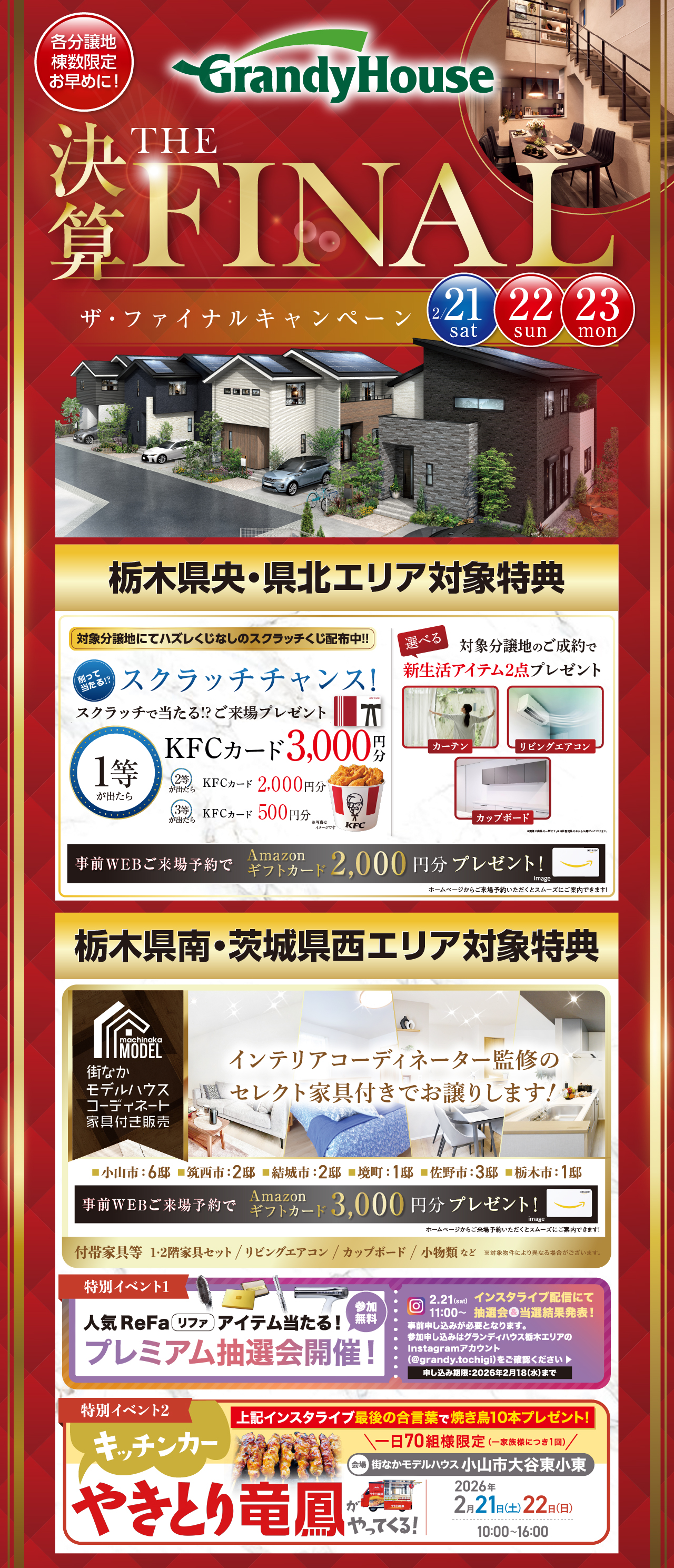 2026決算ザ・ファイナル 45件の分譲地、228件のプランが見つかりました。 〈ご来場プレゼント〉2026年3月22日(日)までに下記掲載のいずれかの会場へお越しください。〈WEBご来場予約プレゼント〉2026年3月22日(日)までに当社ホームページより対象の会場へご来場予約いただいた方が対象。※WEBご来場予約プレゼントはグランディハウス(株)による提供です。本キャンペーンについてのお問い合わせはAmazonではお受けしておりません。グランディハウス事務局ad@grandy.co.jpまでお願いします。Amazon、Amazon.co.jpおよびそのロゴはAmazon.com.inc.またはその関連会社の商標です。〈ご来場プレゼント〉〈WEBご来場予約プレゼント〉とも、アンケートにご回答いただいた、グランディハウスの分譲地を初めてご見学された、住宅購入予定のある新規のご家族が対象。※プレゼント金券は授受トラブル防止のため手渡しのみとします。郵送または投函でのお渡しは行いません。※数に限りがありますので各プレゼントは1家族1回となります。※商品が無くなり次第終了となります。内容が変更となる場合がありますので予めご了承ください。〈ご成約プレゼント〉紙面に掲載の3月末までにお引き渡し可能な対象物件を2026年3月22日(日)までにご成約いただいたお客様が対象。※対象号棟は分譲地により異なります。※商品は当社指定品からお選びいただけます。※ご成約後に解約された場合は本プレゼントの適用対象外となります。※価格改定物件は対象外です。※各プレゼントともその他のサービスとの併用不可。※画像はイメージです。※詳しくは当社スタッフにお尋ねください。 エリア絞込: すべて 宇都宮市 栃木市 佐野市 鹿沼市 小山市 真岡市 大田原市 那須塩原市 さくら市 下野市 下都賀郡壬生町 下都賀郡野木町 すべての物件にチェックを入れる すべてチェック 物件をくらべる まとめて資料請求する 0件の分譲地 物件をくらべる(5件まで) まとめて資料請求する(5件まで) 宇都宮市 簗瀬3丁目 ソラタウン簗瀬3丁目8期 お気に入り登録人数6人 販売戸数: 2戸 販売価格: 4,100万円 (税込) 〜 JR「宇都宮」駅 約1,500m ZEH住宅 × 長期優良住宅認定 ◆静和幼稚園、簗瀬小学校 徒歩13分圏内、たいらや 徒歩10分 ◆通り抜け可能なゆとりある6mの街区内道路 ◆国土交通大臣認定耐力壁「K3」制震ダンパー搭載 来場予約 資料請求(無料) 電話相談 お問い合わせ グランディハウス 宇都宮東支店 宇都宮市中今泉3丁目1-37 0120842233(発信する) 閉じる 分譲地詳細を見る 新着 小山市 雨ケ谷 グランドステージ城南の森7期 お気に入り登録人数11人 販売戸数: 6戸 販売価格: 2,598万円 (税込) 〜 3・7・10・13号棟|子育てグリーン対象物件 【モデルハウス公開中】 全室フルハイトドア採用の4次街区、プラン公開! ◆長期優良住宅認定(第3次街区) ◆通り抜けのできない、住まう方専用の街区内道路で繋がる街並み ◆「ヨークベニマル」「無印良品」など、商業施設エリアが身近な暮らし ◆玄関ドア電子キー/電動シャッター標準装備 来場予約 資料請求(無料) 電話相談 お問い合わせ グランディハウス 県南支社 小山市東城南5丁目1番地9 0120785060(発信する) 閉じる 分譲地詳細を見る 大田原市 浅香3丁目 グランエクセラ浅香3丁目7期 お気に入り登録人数4人 販売戸数: 2戸 販売価格: 2,810万円 (税込) 〜 10号棟!子育てグリーン対象 100万円相当の選べるオプションプレゼント!! 【長期優良住宅認定】 ◆多彩な商業利便が楽しい南大通りそば ◆室温環境の快適性を高めるZEH水準の断熱・省エネ住宅 来場予約 資料請求(無料) 電話相談 お問い合わせ グランディハウス さくら支店 さくら市卯の里3丁目43番地11 1F 0120613001(発信する) 閉じる 分譲地詳細を見る 新着 宇都宮市 峰町 ソラタウン峰小学校北Ⅱ お気に入り登録人数5人 販売戸数: 3戸 販売価格: 4,380万円 (税込) 〜 LRT「陽東3丁目」停留場まで徒歩9分 ZEH住宅 (蓄電池搭載)× 長期優良住宅認定 ◆「峰小学校」まで徒歩4分、ベルモールも近隣に整う優れた住環境 ◆通り抜け可能なゆとりある6mの街区内道路 ◆国土交通大臣認定耐力壁「K3」制震ダンパー搭載 来場予約 資料請求(無料) 電話相談 お問い合わせ グランディハウス 宇都宮東支店 宇都宮市中今泉3丁目1-37 0120842233(発信する) 閉じる 分譲地詳細を見る モデルハウス 小山市 横倉新田 グランクレスト小山市大谷東小東2期 お気に入り登録人数8人 販売戸数: 11戸 販売価格: 2,795万円 (税込) 〜 3〜6・8〜10・12・20号棟|子育てグリーン対象物件 2/21(土)インスタライブ配信 〈おウチでモデルハウス見学・PREMIUM抽選会開催!〉 ◆保育園・小学校・中学校まで徒歩6分圏内 ◆長期優良住宅認定 ◆ZEH水準の断熱・省エネ性能×オール電化 ◆「横倉地区まちづくり構想」による未来に向けたまちづくりが進行中 ※最新情報・詳細は小山市HPへ https://www.city.oyama.tochigi.jp/kurashi/toshikeikaku/machizukuri/page002704.html 来場予約 資料請求(無料) 電話相談 お問い合わせ グランディハウス 県南支社 小山市東城南5丁目1番地9 0120785060(発信する)