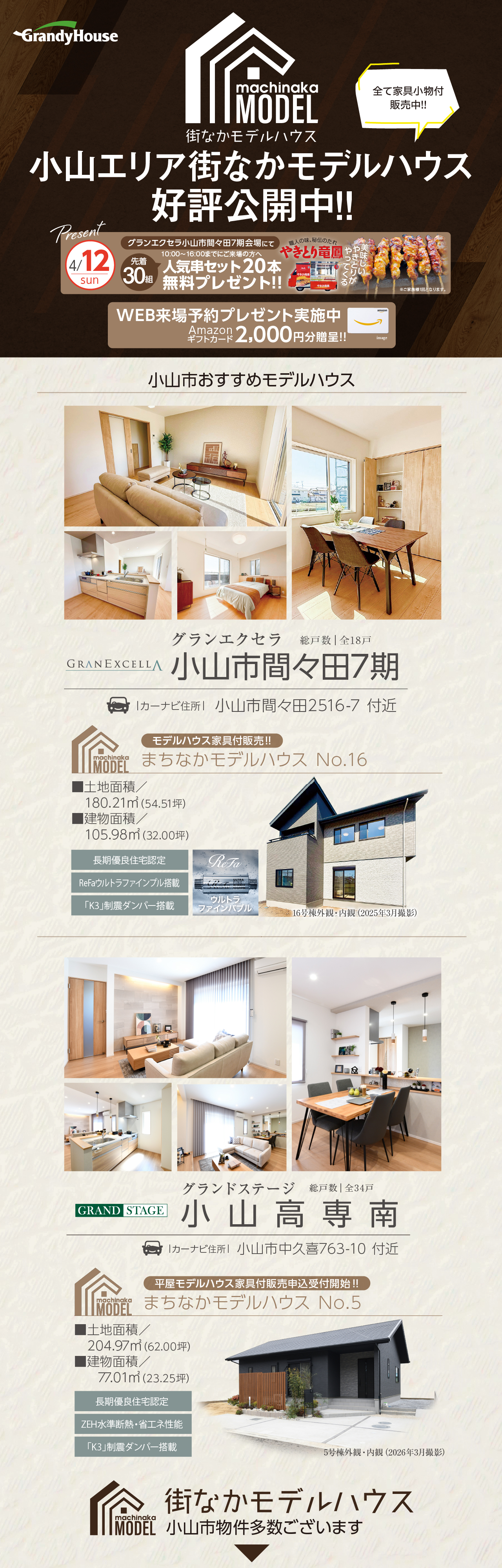 小山エリア街なかモデルハウス販売 6件の分譲地、43件のプランが見つかりました。 エリア絞込: すべて 小山市 すべての物件にチェックを入れる すべてチェック 物件をくらべる まとめて資料請求する 0件の分譲地 物件をくらべる(5件まで) まとめて資料請求する(5件まで) モデルハウス 小山市 中久喜 グランドステージ小山高専南 お気に入り登録人数1人 販売戸数: 7戸 販売価格: 3,110万円 (税込) 〜 5〜8号棟|子育てグリーン最大80万円対象物件 【長期優良住宅 × 60年サポート × 制震ダンパー搭載】 〈平屋&2階建〉モデルハウス完成 ◆街区内専用道路に囲まれた、全34邸の大型分譲地 ◆「イオンモール小山」が徒歩10分の距離で、生活利便性の高い住環境 ◆新4号国道そば、各方面へのアクセスがスムーズ 来場予約 資料請求(無料) 電話相談 お問い合わせ グランディハウス 県南支社 小山市東城南5丁目1番地9 0120785060(発信する) 閉じる 分譲地詳細を見る モデルハウス 小山市 間々田 グランエクセラ小山市間々田7期 お気に入り登録人数人 販売戸数: 11戸 販売価格: 2,830万円 (税込) 〜 5・6・16号棟|子育てグリーン最大80万円対象物件 【室内の水全てがウルトラファインバブル】 個性と品格を纏う上質な外観デザイン 【長期優良住宅認定 ✕ K3制震ダンパー採用】 静けさに包まれた街並みで、活気あふれる暮らしを送るためのアイデアプラン〈18邸〉、誕生 ◆街区内道路とワンエントランスがつなぐ、安心の18邸 ◆モノクロを基調に自然の質感を取り入れることで落ち着きと品格を演出する外観デザイン ◆最も規制の厳しい「第一種低層住居専用地域」が、空の広さを永く保証 来場予約 資料請求(無料) 電話相談 お問い合わせ グランディハウス 県南支社 小山市東城南5丁目1番地9 0120785060(発信する) 閉じる 分譲地詳細を見る モデルハウス 小山市 羽川 彩りの杜 小山市羽川11期 お気に入り登録人数6人 販売戸数: 8戸 販売価格: 2,980万円 (税込) 〜 16・28号棟|子育てグリーン最大80万円対象物件 全棟【長期優良住宅×60年サポート】 土地面積200㎡以上、宅配ボックス装備 ◆長期優良住宅認定 ◆全棟オール電化&ZEH水準の断熱・省エネ性能の住まい ◆国道4号線そば、小山エリア・小金井エリアへスムーズにアクセス 来場予約 資料請求(無料) 電話相談 お問い合わせ グランディハウス 県南支社 小山市東城南5丁目1番地9 0120785060(発信する) 閉じる 分譲地詳細を見る モデルハウス 小山市 雨ケ谷 グランドステージ城南の森7期 お気に入り登録人数12人 販売戸数: 6戸 販売価格: 2,598万円 (税込) 〜 7・10・13・14号棟|子育てグリーン最大80万円対象物件 【モデルハウス公開中】 全室フルハイトドア採用の4次街区、プラン公開! ◆長期優良住宅認定(第3・4次街区) ◆通り抜けのできない、住まう方専用の街区内道路で繋がる街並み ◆「ヨークベニマル」「無印良品」など、商業施設エリアが身近な暮らし ◆玄関ドア電子キー/電動シャッター標準装備 来場予約 資料請求(無料) 電話相談 お問い合わせ グランディハウス 県南支社 小山市東城南5丁目1番地9 0120785060(発信する) 閉じる 分譲地詳細を見る モデルハウス 小山市 横倉 グランドステージ小山市横倉3期 お気に入り登録人数6人 販売戸数: 8戸 販売価格: 2,588万円 (税込) 〜 1・3・5・6号棟|子育てグリーン最大80万円対象物件 【家具付きモデルハウス】 見て、触れて、すぐ住める長期優良住宅 ◆通勤やお出かけをスムーズにこなす、新4号国道の交差点近くの立地 ◆開放感や寛ぎ、機能性も兼ね備えたインナーデザインの13邸 ◆ZEH水準の断熱・省エネ性能×オール電化 ◆電動シャッター・玄関ドア電子キー標準装備 来場予約 資料請求(無料) 電話相談 お問い合わせ グランディハウス 県南支社 小山市東城南5丁目1番地9 0120785060(発信する) 閉じる 分譲地詳細を見る モデルハウス 小山市 犬塚 Park side avenue 犬塚IV お気に入り登録人数2人 販売戸数: 3戸 販売価格: 3,630万円 (税込) 〜 4号棟|子育てグリーン最大80万円対象物件 【長期優良住宅×60年サポート】 「大谷北小学校」まで徒歩6分|敷地面積最大79坪 ◆長期優良住宅認定 ◆ZEH水準の断熱・省エネ性能&オール電化 ◆大谷北小学校まで徒歩5〜6分 ◆LDK|アクセントウォールや天井まで届いて空間に馴染むハイドア仕様 ◆畳敷部屋|モダンなインテリアにも調和する半畳タタミ採用 来場予約 資料請求(無料) 電話相談 お問い合わせ グランディハウス 筑西支店 筑西市乙385-1 0120036566(発信する) 閉じる 分譲地詳細を見る 6件の分譲地、43件のプランが見つかりました。 近隣エリアを探す 宇都宮市 真岡市 鹿沼市 河内郡上三川町 小山市 栃木市 佐野市 足利市 下野市 下都賀郡壬生町 下都賀郡野木町 塩谷郡高根沢町 さくら市 矢板市 大田原市 那須塩原市 0分譲地0プランが見つかりました この条件で検索する 物件特集 別の方法で住まいを探す 市町村から探す MAPから探す 今の家賃から探す 学区から探す 沿線・駅から探す 特集から探す