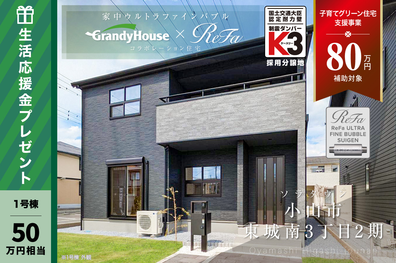春の新生活応援フェア 30件の分譲地、151件のプランが見つかりました。 〈ご成約特典〉下記掲載の対象物件を2026年5月10日(日)までにご成約いただいたお客様が対象です。※対象号棟は分譲地により異なります。※ご成約後に解約された場合は本プレゼントの適用対象外となります。※各プレゼントとも、その他のサービスとの併用はできません。※掲載の画像はすべてイメージです。※詳しくは当社スタッフにお尋ねください。 〈特別イベント1〉お申込みフォームにご記入・送信後、グランディハウス栃木エリアのInstagramアカウント(@grandy.tochigi)をフォローしてください。※抽選結果発表は、お申込みフォームにご入力いただいた「ニックネーム」と「市町村名」を発表します。※配信当日にご視聴いただけない場合には、後日、同アカウントで当選者の発表がございますので、そちらをご覧ください。※お持ちのアカウントにつき1回のお申込みとさせていただきます。※同一の方から複数アカウントにてのお申込みが確認された場合は、当選は無効といたします。※未成年の方はご参加いただけません。※当選された方には、後日、ご自宅に賞品をお届けいたします。※詳しくは表面のフリーダイヤルよりお問い合わせください。 〈特別イベント2〉当社分譲の住宅のご購入あるいは今後のご購入をご検討中のお客様に限ります。※事前に簡単なアンケートへご記入の上、特別イベント1の最後の合言葉をお伝えいただくことで、催しにご参加いただけます。 <その他> ※お食事がなくなり次第終了となります。※詳しくは当社スタッフまでお尋ねください。※駐車場での事故・トラブル等については一切関与いたしません。 〈WEBご来場予約特典〉2026年5月10日(日)までに当社ホームページよりいずれかの会場へご来場予約いただいた方が対象です。※ご来場いただいた分譲地でアンケートにご回答いただいた、グランディハウスの分譲地を初めてご見学された、住宅購入予定のある新規のご家族が対象です。※プレゼント金券は授受トラブル防止のため手渡しのみとなります。郵送または弊社スタッフによる投函でのお渡しは行っておりません。※数に限りがありますので各プレゼントは1家族1回とさせていただきます。※商品が無くなり次第終了となります。また、内容が変更となる場合がございますので、予めご了承ください。ご来場特典はグランディハウス(株)による提供です。本キャンペーンについてのお問い合わせはAmazonではお受けしておりません。グランディハウス事務局ad@grandy.co.jpまでお願いします。Amazon、Amazon.co.jpおよびそのロゴはAmazon.com.inc.またはその関連会社の商標です。 エリア絞込: すべて 宇都宮市 栃木市 佐野市 鹿沼市 小山市 大田原市 那須塩原市 さくら市 下野市 下都賀郡壬生町 すべての物件にチェックを入れる すべてチェック 物件をくらべる まとめて資料請求する 0件の分譲地 物件をくらべる(5件まで) まとめて資料請求する(5件まで) 価格改定 モデルハウス 下野市 上大領 グランドステージ上大領5期 お気に入り登録人数人 販売戸数: 6戸 販売価格: 3,199万円 (税込) 〜 1〜5号棟!子育てグリーン最大80万円対象 3号棟 価格改定|3,380万円 4号棟 価格改定|3,280万円 【長期優良住宅認定 ✕ K3制震ダンパー採用】 ◆敷地面積最大94坪|最大4台分の駐車スペースを確保 ◆モノトーンを基調に色数を抑え、シックな雰囲気の街並みデザイン 来場予約 資料請求(無料) 電話相談 お問い合わせ グランディハウス 本社営業部 宇都宮市大通り4丁目3番18号 0120267777(発信する) 閉じる 分譲地詳細を見る 価格改定 小山市 横倉新田 グランクレスト小山市大谷東小東2期 お気に入り登録人数9人 販売戸数: 7戸 販売価格: 3,130万円 (税込) 〜 3〜6・8号棟|子育てグリーン最大80万円対象物件 通学も安心、お買い物も身近な利便ロケーション ◆保育園・小学校・中学校まで徒歩6分圏内 ◆長期優良住宅認定 ◆ZEH水準の断熱・省エネ性能×オール電化 ◆「横倉地区まちづくり構想」による未来に向けたまちづくりが進行中 ※最新情報・詳細は小山市HPへ https://www.city.oyama.tochigi.jp/kurashi/toshikeikaku/machizukuri/page002704.html 来場予約 資料請求(無料) 電話相談 お問い合わせ グランディハウス 県南支社 小山市東城南5丁目1番地9 0120785060(発信する) 閉じる 分譲地詳細を見る 小山市 東城南 ソラタウン小山市東城南3丁目2期 お気に入り登録人数2人 販売戸数: 1戸 販売価格: 4,270万円 (税込) 1号棟|子育てグリーン最大80万円対象物件 〈ウルトラファインバブルスイゲン〉採用 「東城南小学校」まで徒歩4分 【長期優良住宅認定 ✕ ZEH ✕ おひさまエコキュート ✕ K3制震ダンパー採用】 さらに建物内すべての水に、ウルトラファインバブルを 行き渡らせる「スイゲン」を採用。 来場予約 資料請求(無料) 電話相談 お問い合わせ グランディハウス 県南支社 小山市東城南5丁目1番地9 0120785060(発信する) 閉じる 分譲地詳細を見る 価格改定 モデルハウス 小山市 横倉 グランド