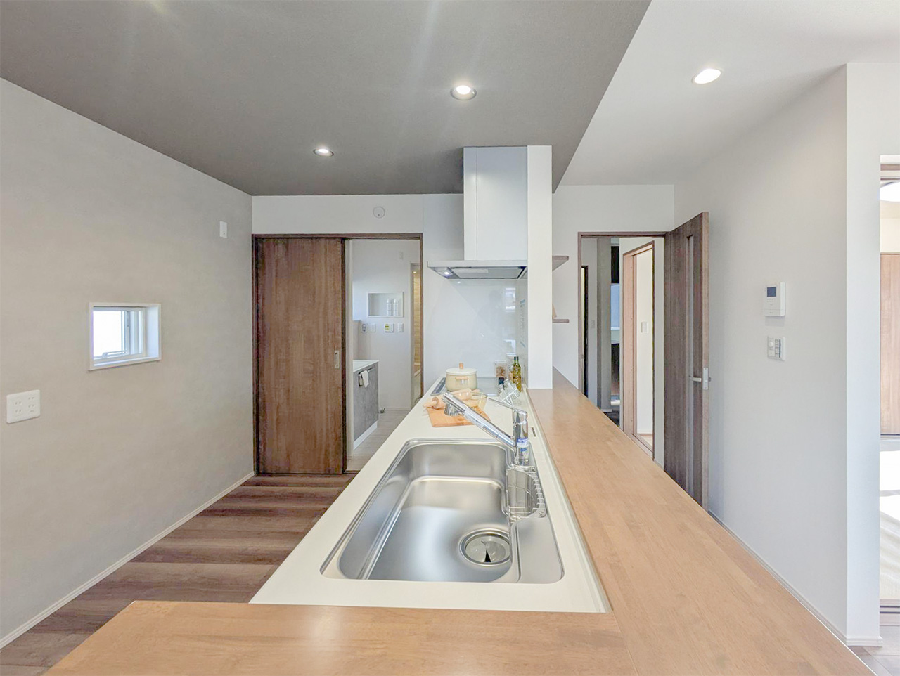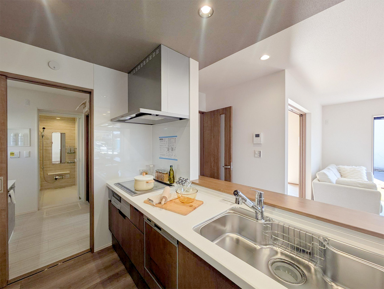 キッチンから洗面室・浴室までを最短距離で結んだ水回り動線設計。家事の移動距離を短縮するとともに、動線上には収納スペースなどをレイアウトし機能性も高めました。スマートな動線設計と時短設備が子育てにがんばるご家族をサポートします。