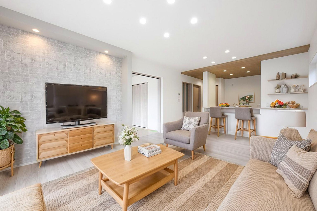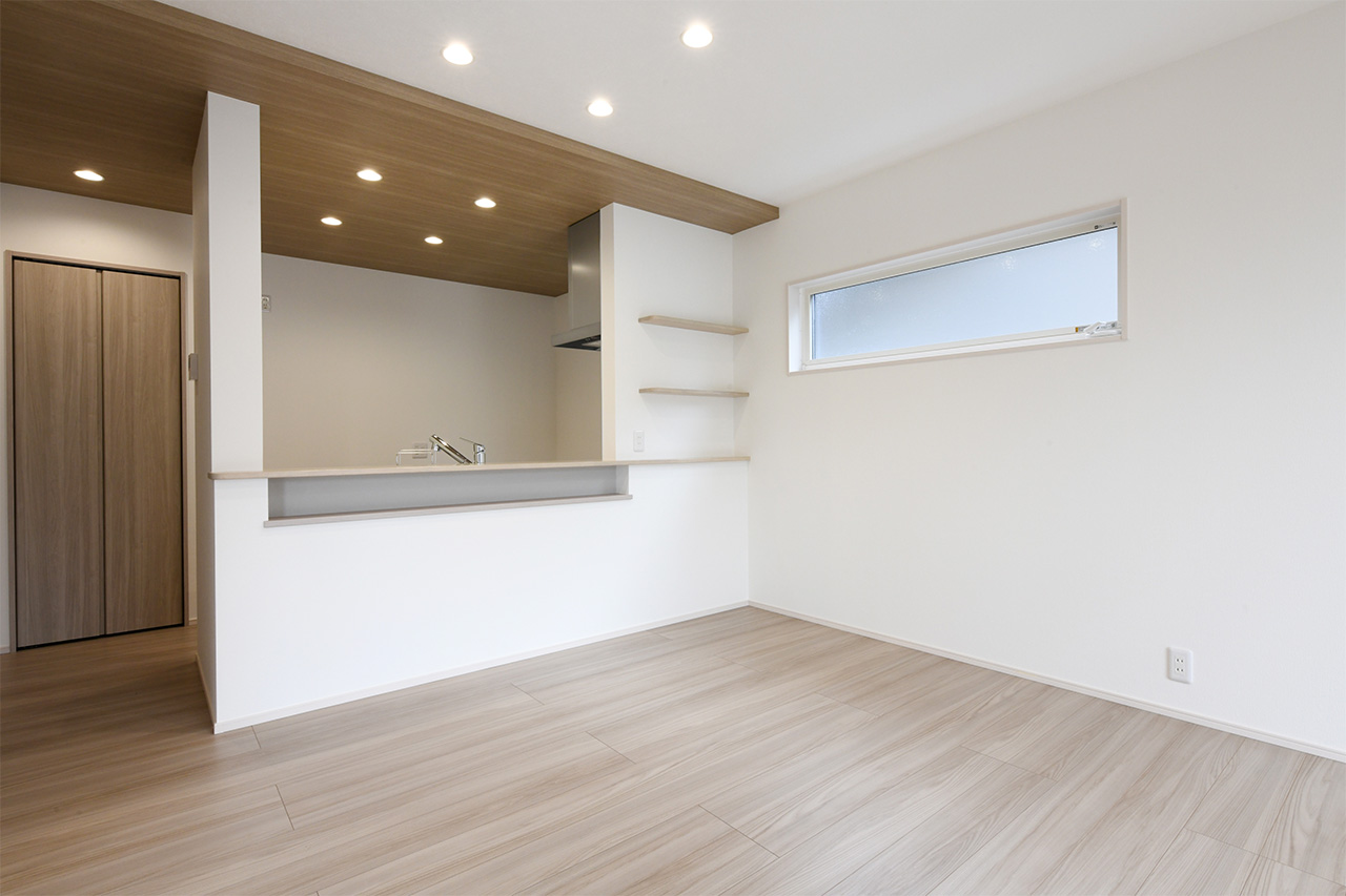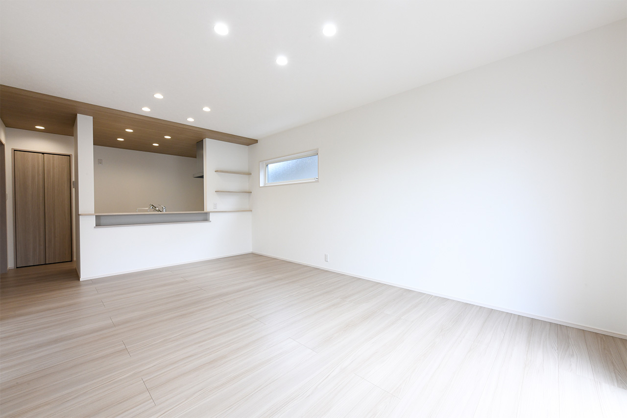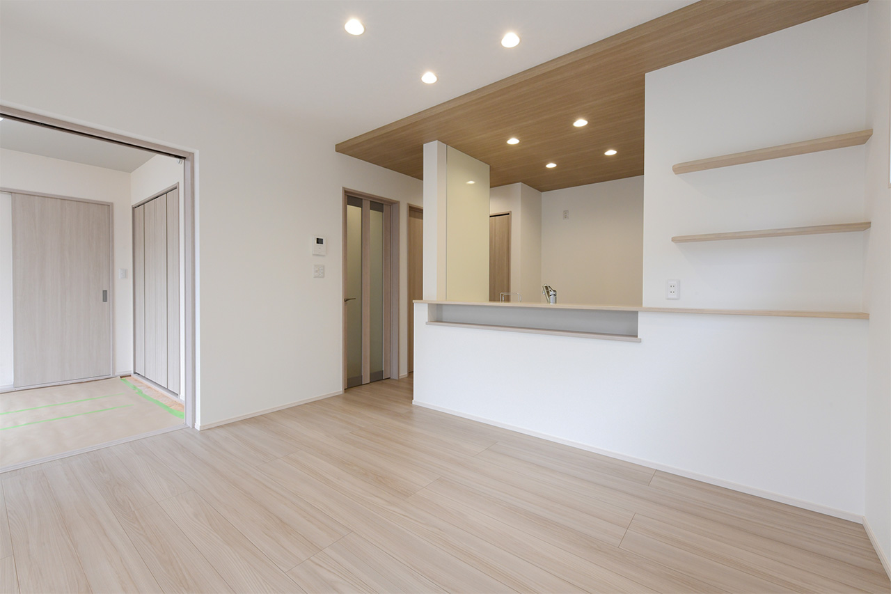 キッチンから洗面室・浴室までを最短距離で結んだ水回り動線設計。家事の移動距離を短縮するとともに、動線上には収納スペースなどをレイアウトし機能性も高めました。スマートな動線設計と時短設備が子育てにがんばるご家族をサポートします。