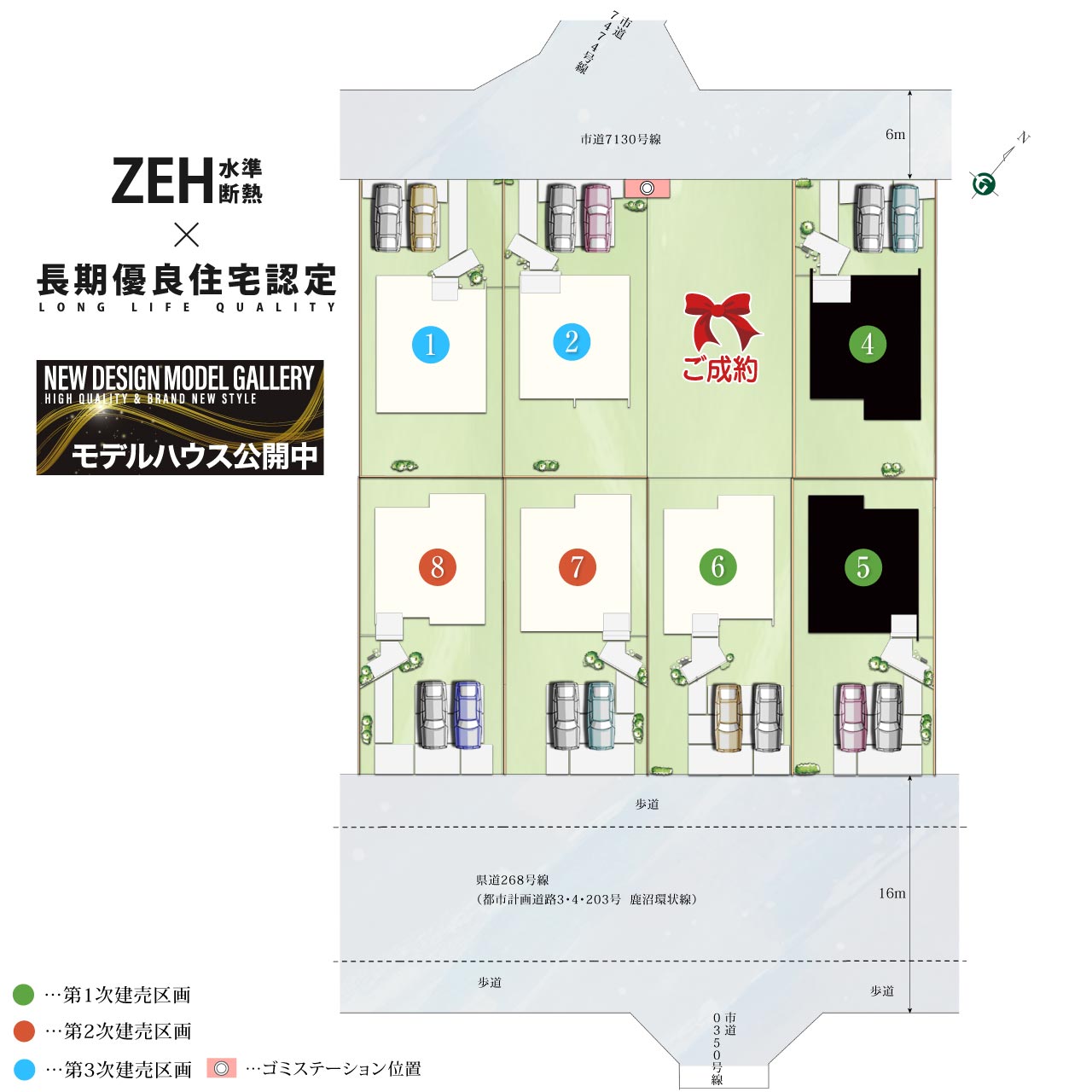 | 備考2 | ※各号地の上空を電線が通過します。 ※掲載の図面は計画段階の図面を基に描き起こしたもので、実際とは異なる場合がございます。また、施工上の理由及び改良のため変更することがございます。 【お詫びと訂正】 4号棟は、「家具付住宅」として新たな販売仕様へと変更する運びとなりました。 これに伴い、2025年11月19日より販売価格を改定しております。ご検討中のお客様には多大なるご迷惑をお掛けしますことを謹んでお詫び申し上げます。 |