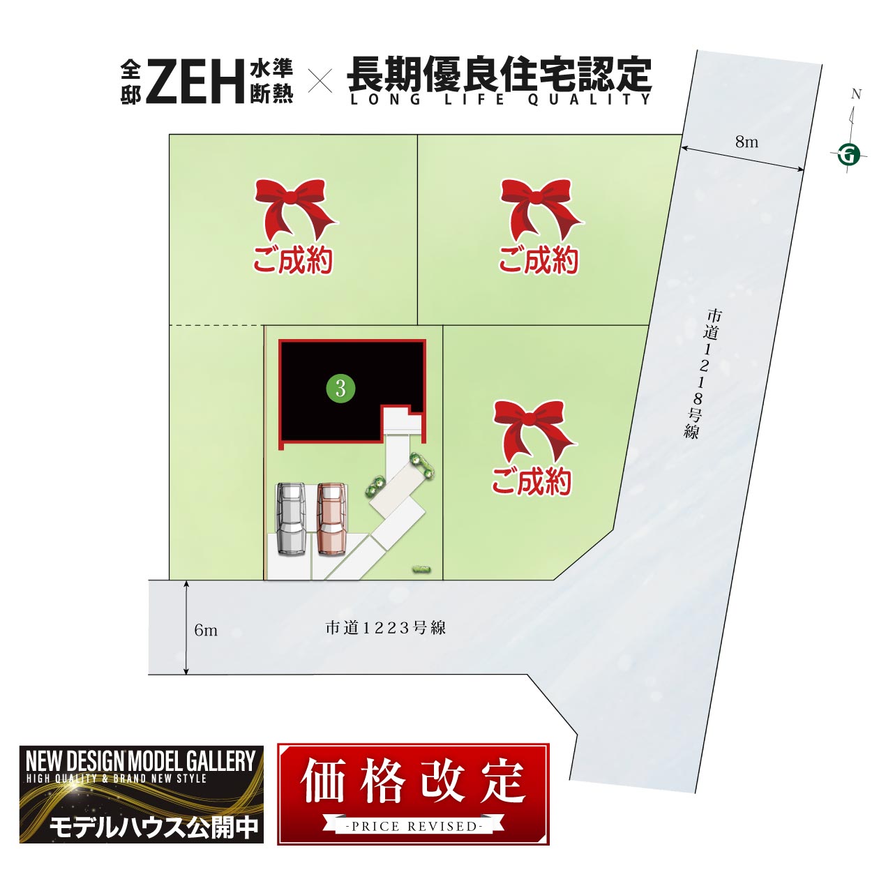 | 備考2 | ※各号地の上空を電線が通過します。 ※1号地の電柱に自治会管理の防犯灯が設置されています。 ※3号地の電柱に真岡警察署管理の標識が設置されています。 ※掲載の図面は計画段階の図面を基に描き起こしたもので、実際とは異なる場合がございます。また、施工上の理由及び改良のため変更することがございます。 ※価格改定/3号棟(公示日:2025年11月19日) |