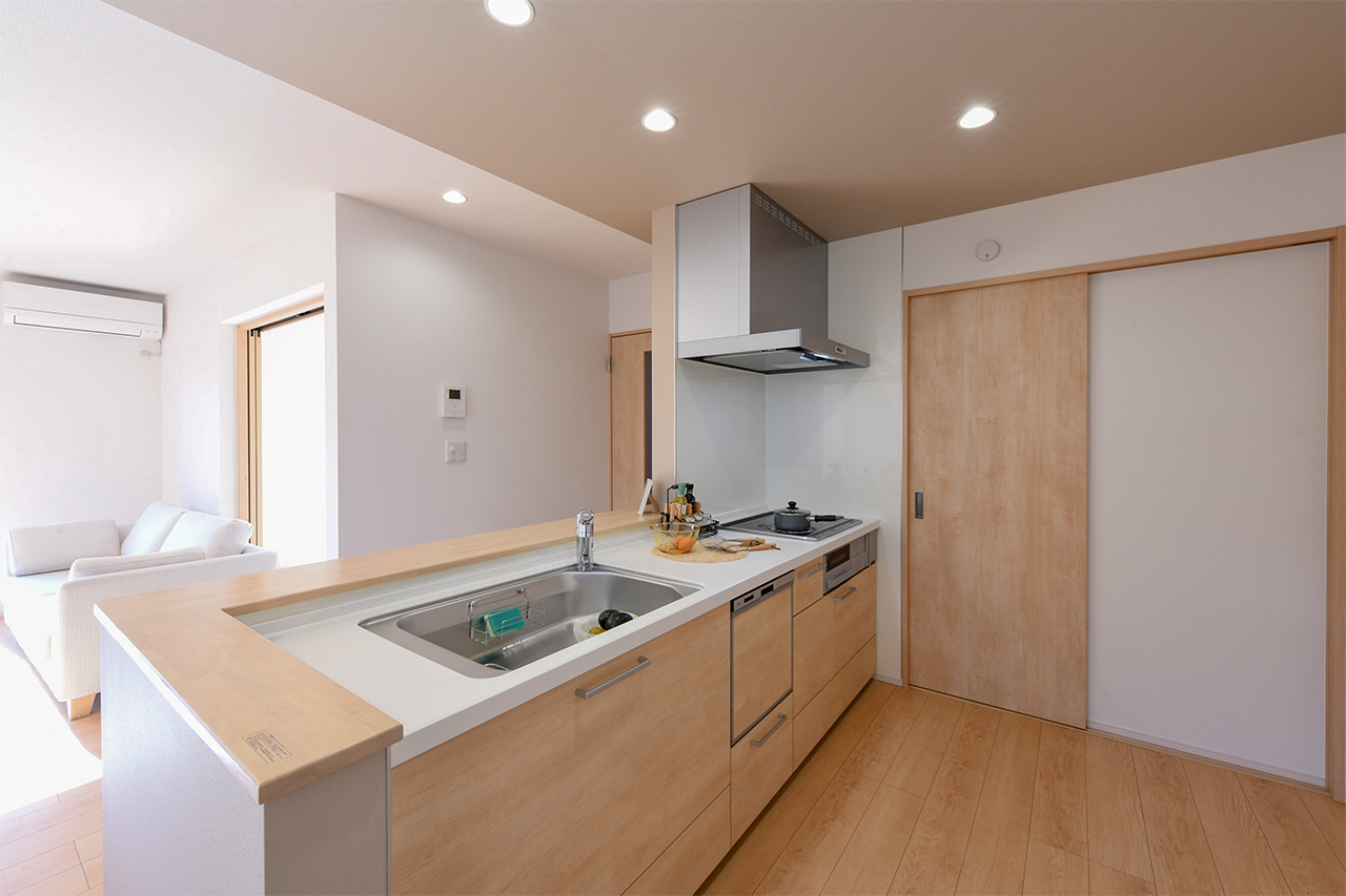 キッチンから洗面室・浴室までを最短距離で結んだ水回り動線設計。家事の移動距離を短縮するとともに、動線上には収納スペースなどをレイアウトし機能性も高めました。スマートな動線設計と時短設備が子育てにがんばるご家族をサポートします。
