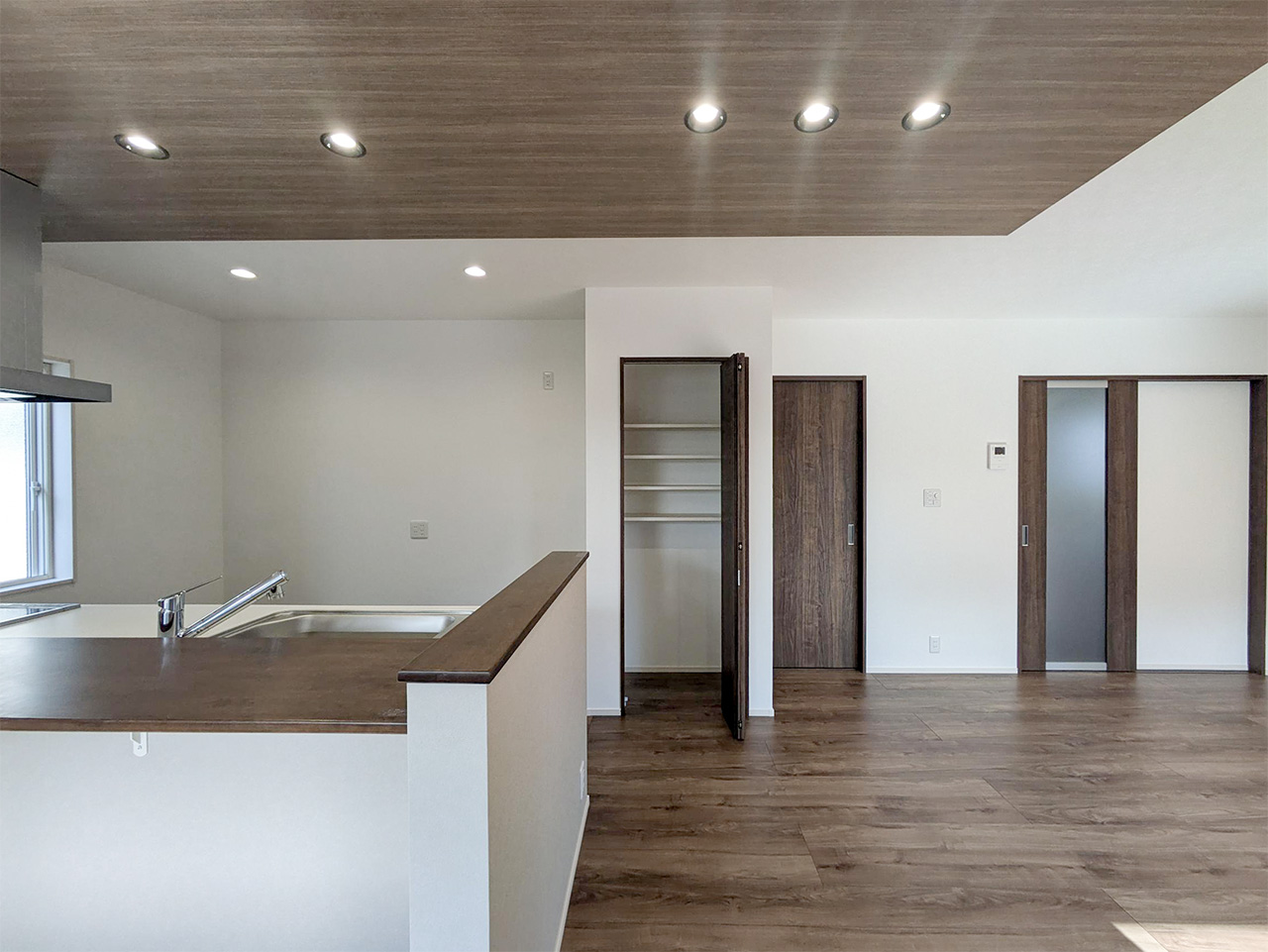 システムキッチンのすぐそばに配置したパントリー。ストック食品や調味料やお酒のほか、非常食や水のペットボトルなどの防災用品も収納できます。キッチンからすぐ手が届く場所にあるから、整理整頓もテキパキできて、キッチン空間をスッキリ保てます。