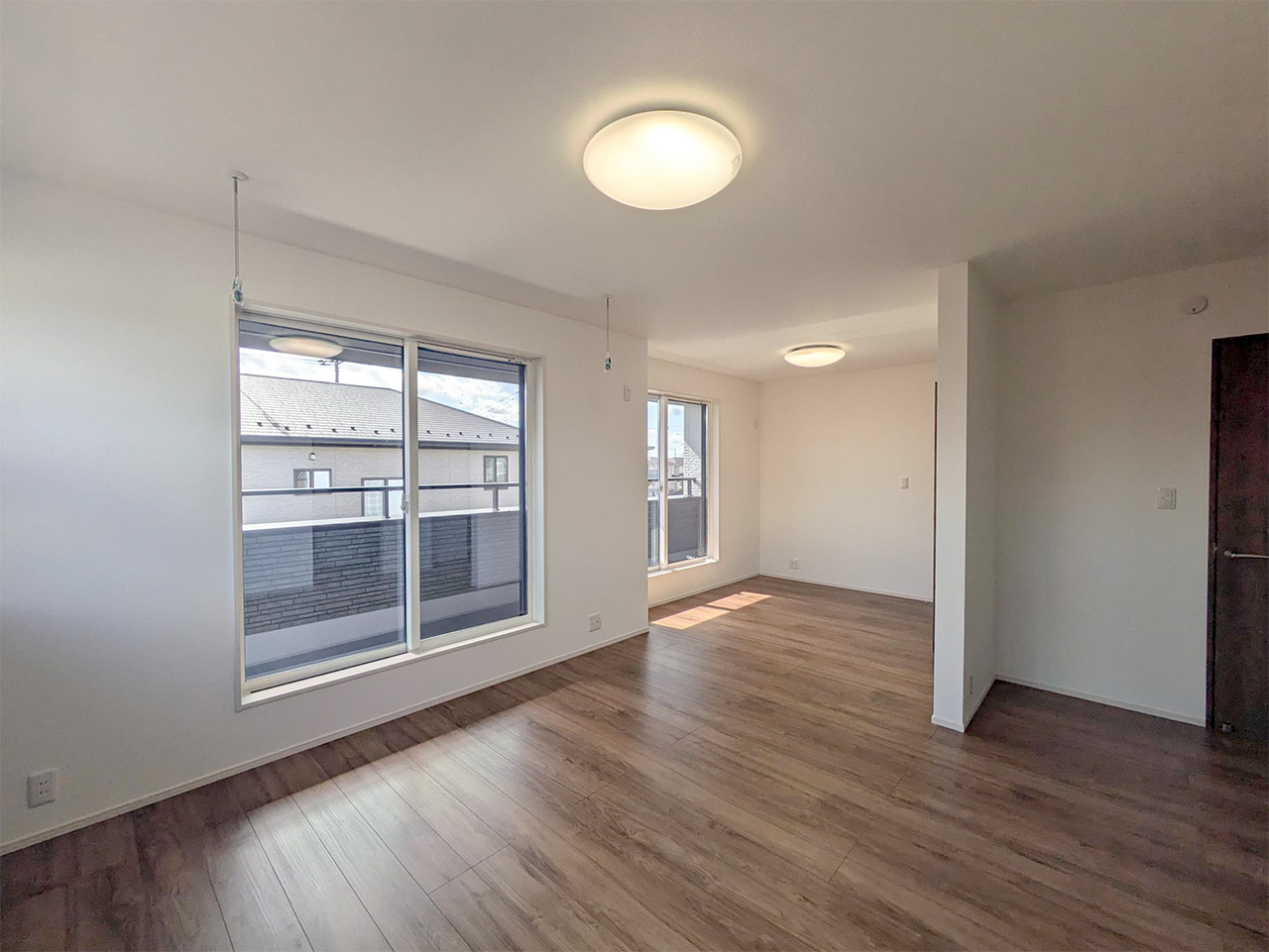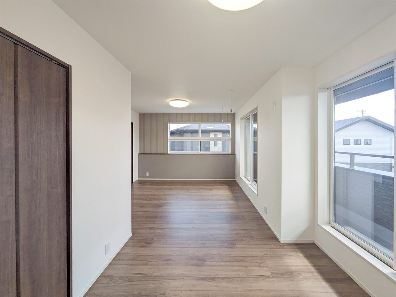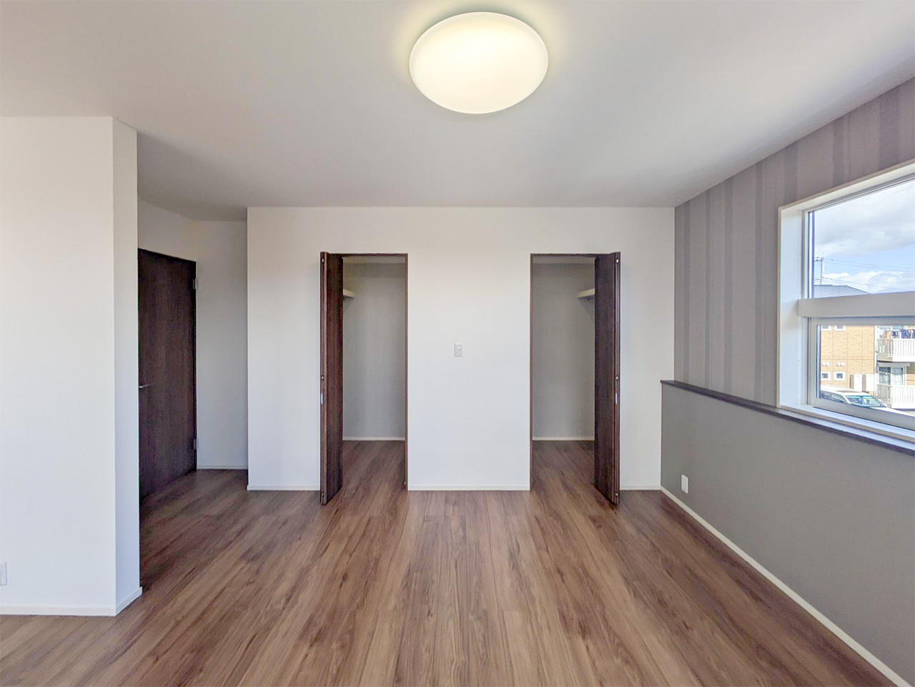 2つの空間に間仕切り可能な、広々とした2階2ドア1ルーム。子供が生まれる前、赤ちゃんが生まれてから、そして大きくなって個室を持つようになるまで対応。子ども達が独立したら広々としたご夫婦の書斎や趣味の部屋にも。ご家族の成長といっしょに変わっていく自由な家づくりが可能です。※間仕切り壁の設置は有料オプションとなります。