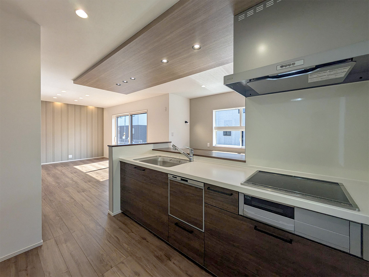 家族でのコミュニケーションがとれる対面型システムキッチンです。横一列にシンクとコンロをまとめたシンプルな形です。動きやすさとスタイリッシュなデザインが魅力です。