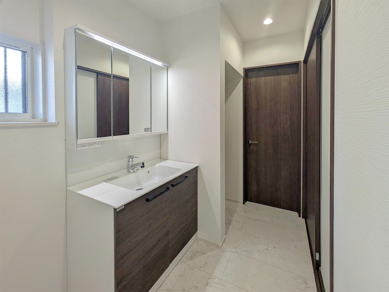 タオルや洗濯用品などのストックに嬉しいリネン庫。入浴後の下着やパジャマの置き場所としてもとっても便利。カゴやケースを利用して、バスタオルや下着類、洗濯物など種類別に整理して、見た目も使い勝手もスマートに。そのまま洗濯機に入れたくない汚れた洗濯物は一番下のスペースに。家族のなかでルールを決めて誰でも使いやすく。子ども達の自主性も育みます。
