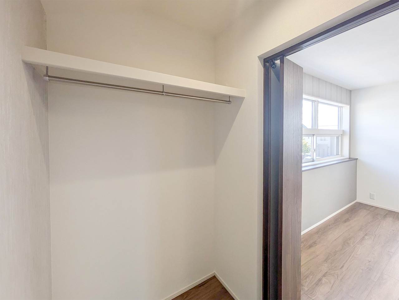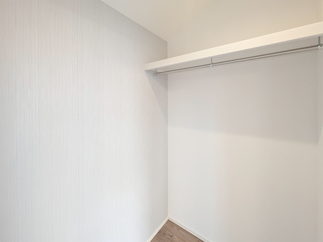 ご夫婦や子ども達の衣類をたっぷりしまえる大容量のウォークインクローゼット。季節の衣類から鞄や帽子などの小物までたっぷり保管可能。ウォークインタイプなので衣類の出し入れや整理整頓もスムーズに行えます。