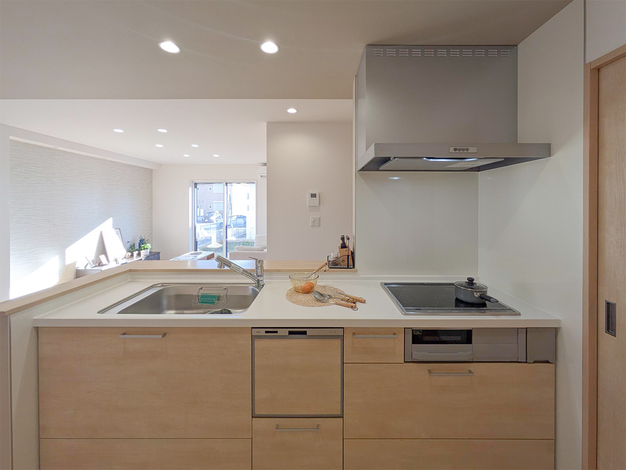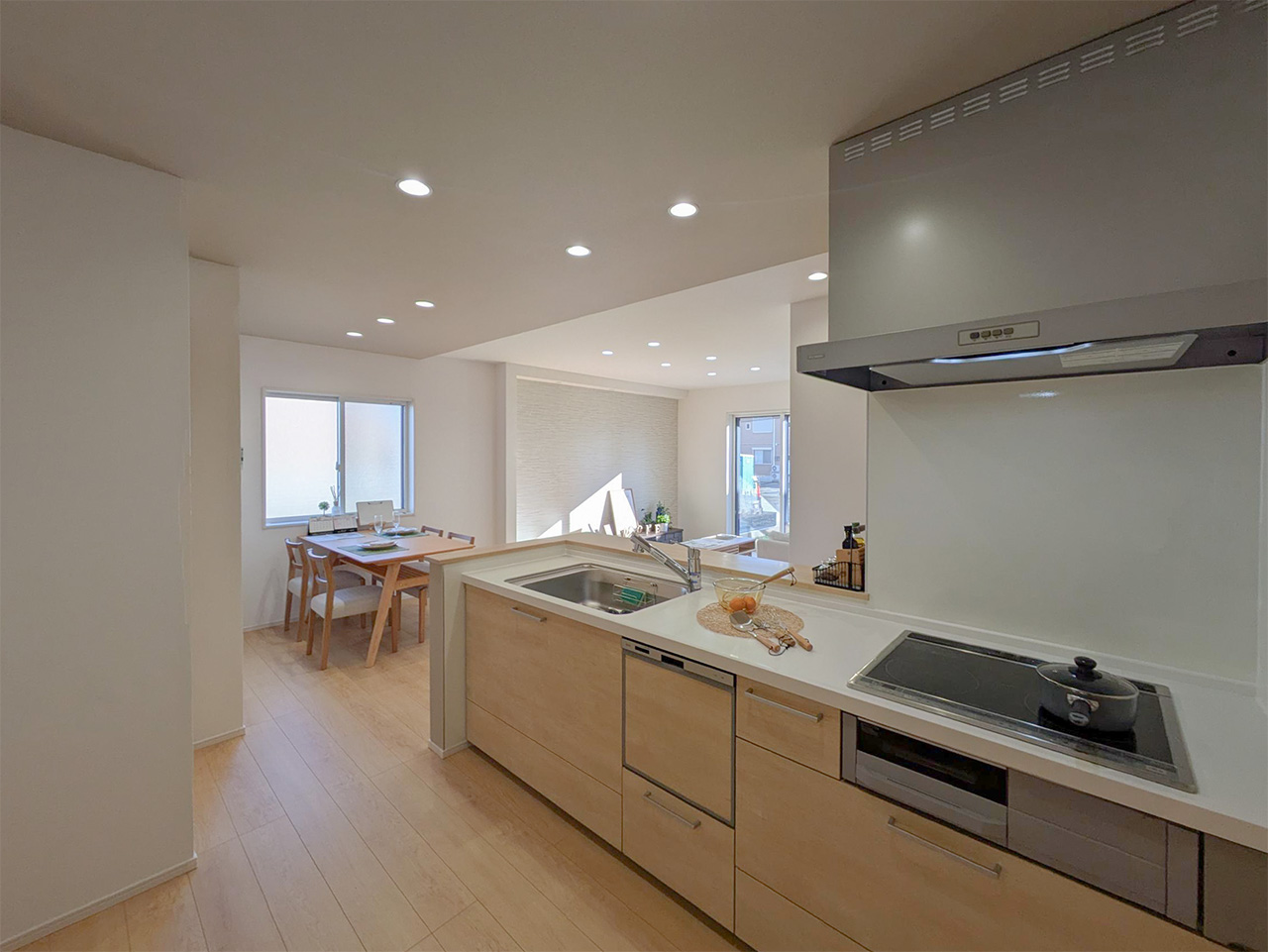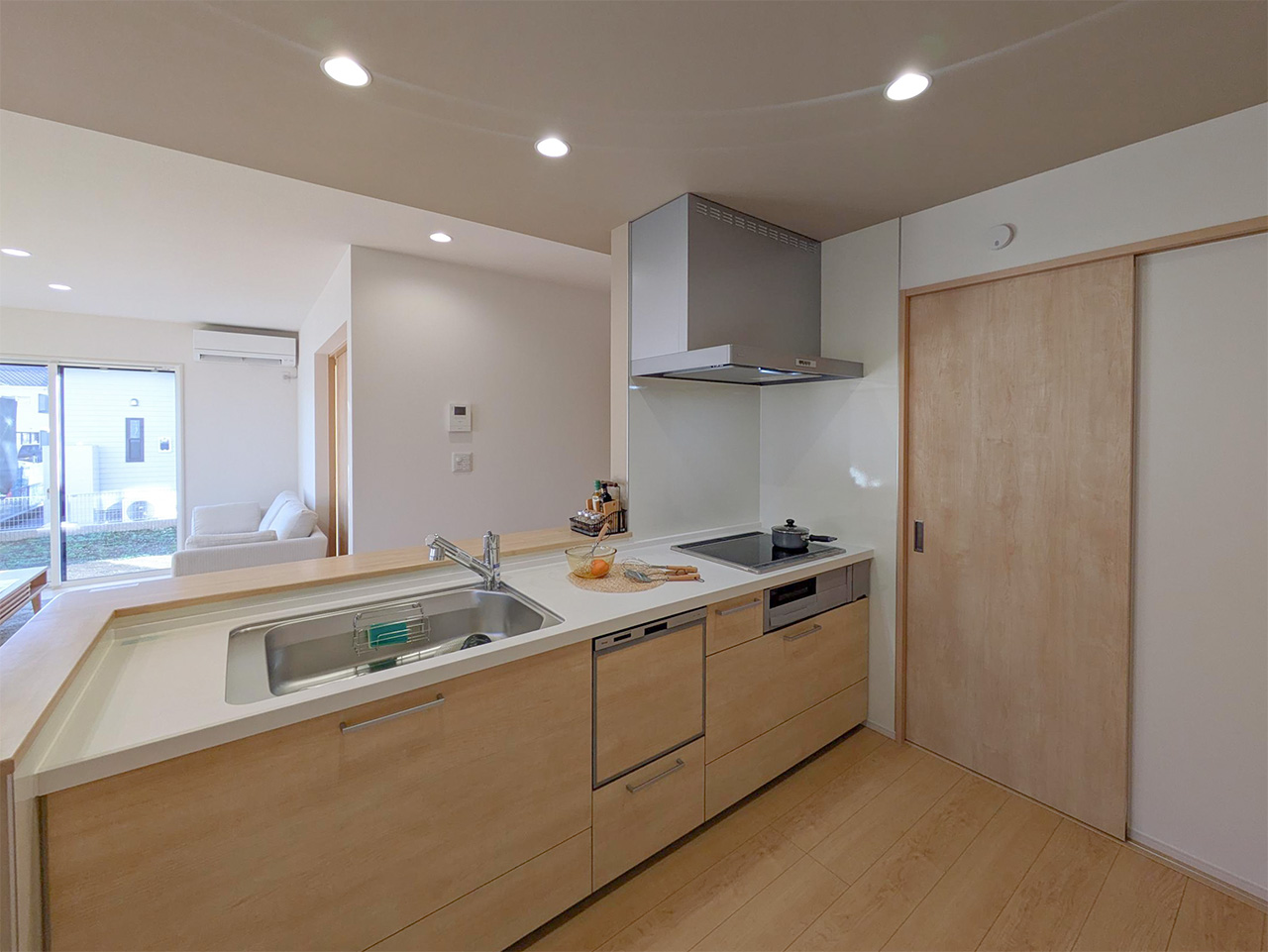 キッチンから洗面室・浴室までを最短距離で結んだ水回り動線設計。家事の移動距離を短縮するとともに、動線上には収納スペースなどをレイアウトし機能性も高めました。スマートな動線設計と時短設備が子育てにがんばるご家族をサポートします。