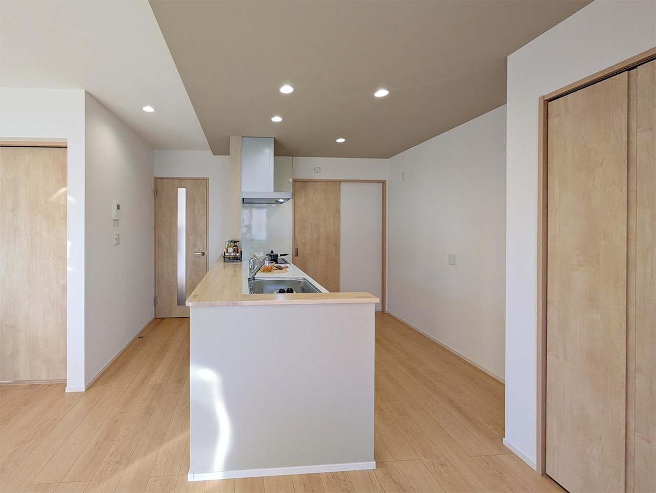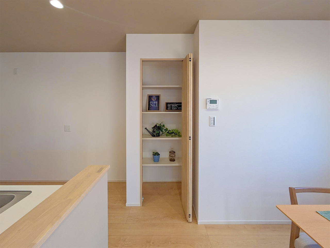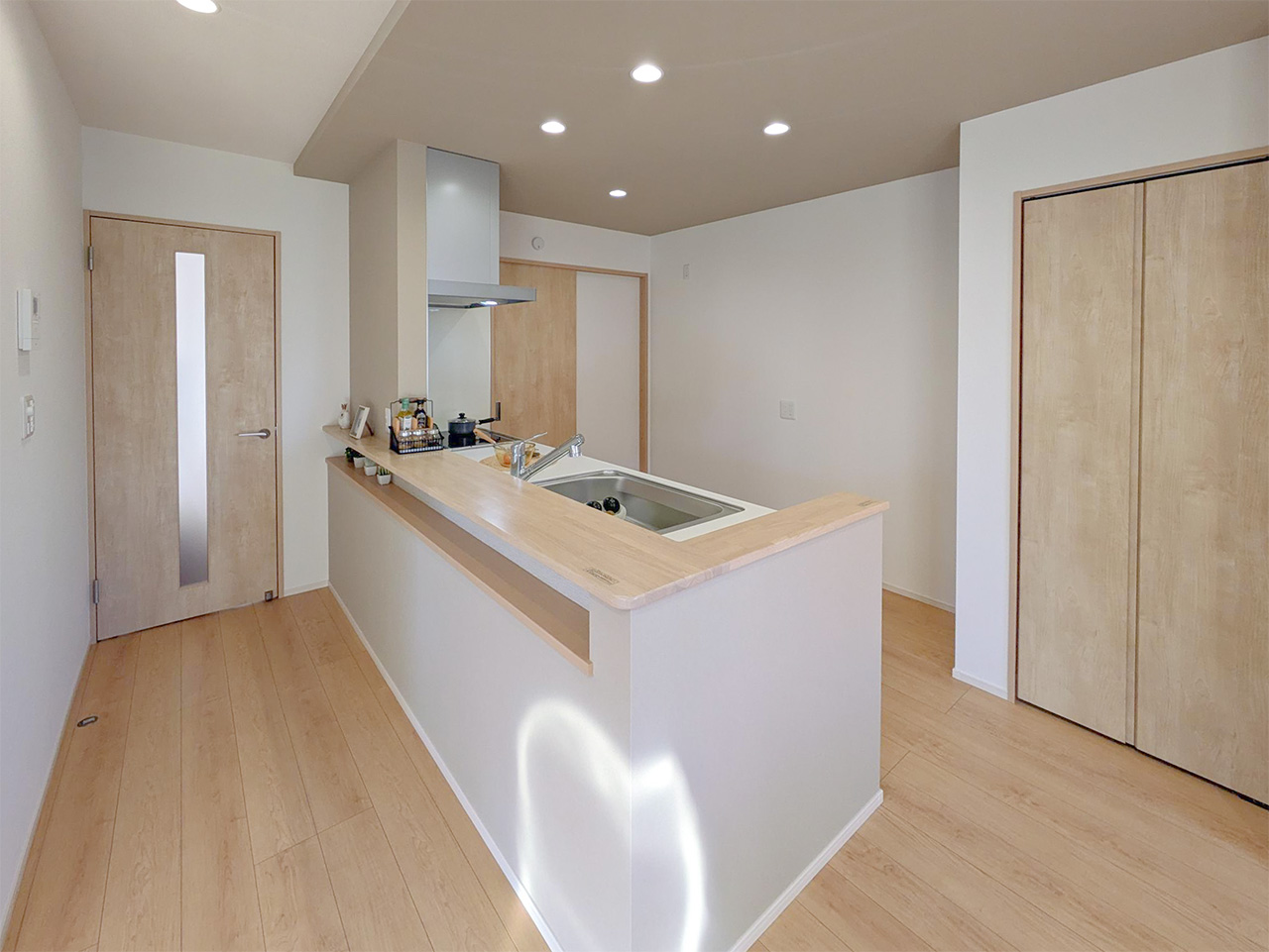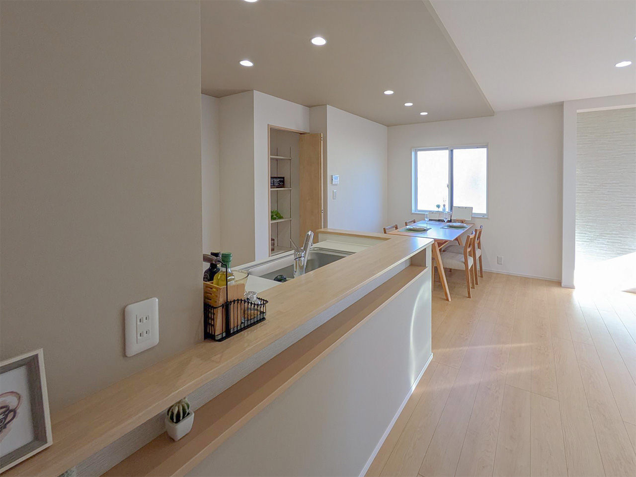 キッチンから洗面室・浴室までを最短距離で結んだ水回り動線設計。家事の移動距離を短縮するとともに、動線上には収納スペースなどをレイアウトし機能性も高めました。スマートな動線設計と時短設備が子育てにがんばるご家族をサポートします。