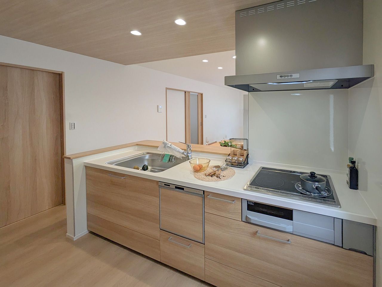 家族でのコミュニケーションがとれる対面型システムキッチンです。横一列にシンクとコンロをまとめたシンプルな形です。動きやすさとスタイリッシュなデザインが魅力です。