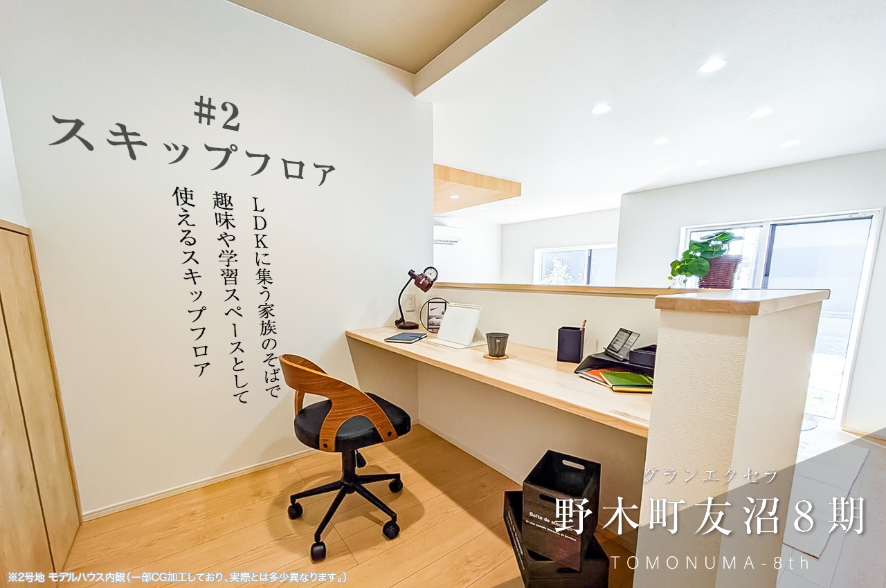リビング階段の踊り場を利用したステージリビング。子どもが遊んだり、リビング学習をしたりと、リビングに子ども達の居場所を創るスペースです。もちろん、家族が自由に使えるスペースとして、様々なライフシーンを個性的に紡ぐアイデア空間です。