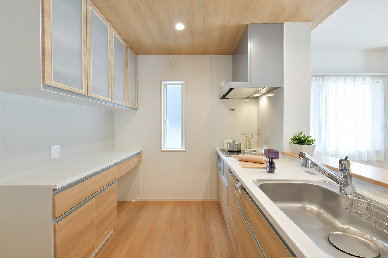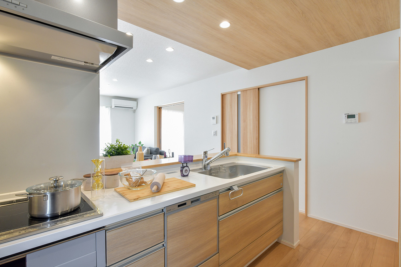 家族でのコミュニケーションがとれる対面型システムキッチン。横一列にシンクとコンロをまとめたシンプルな形です。動きやすさとスタイリッシュなデザインが魅力。
