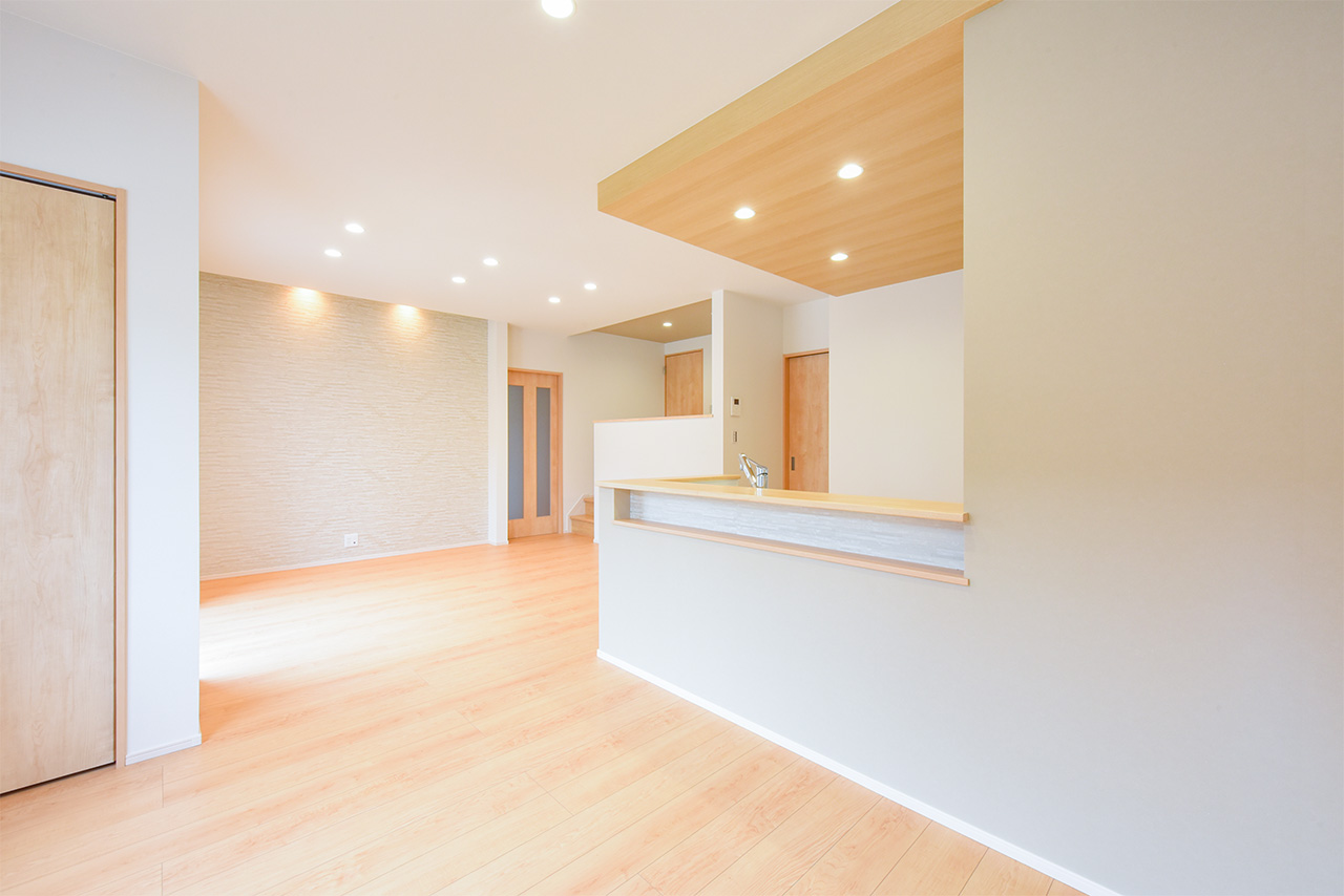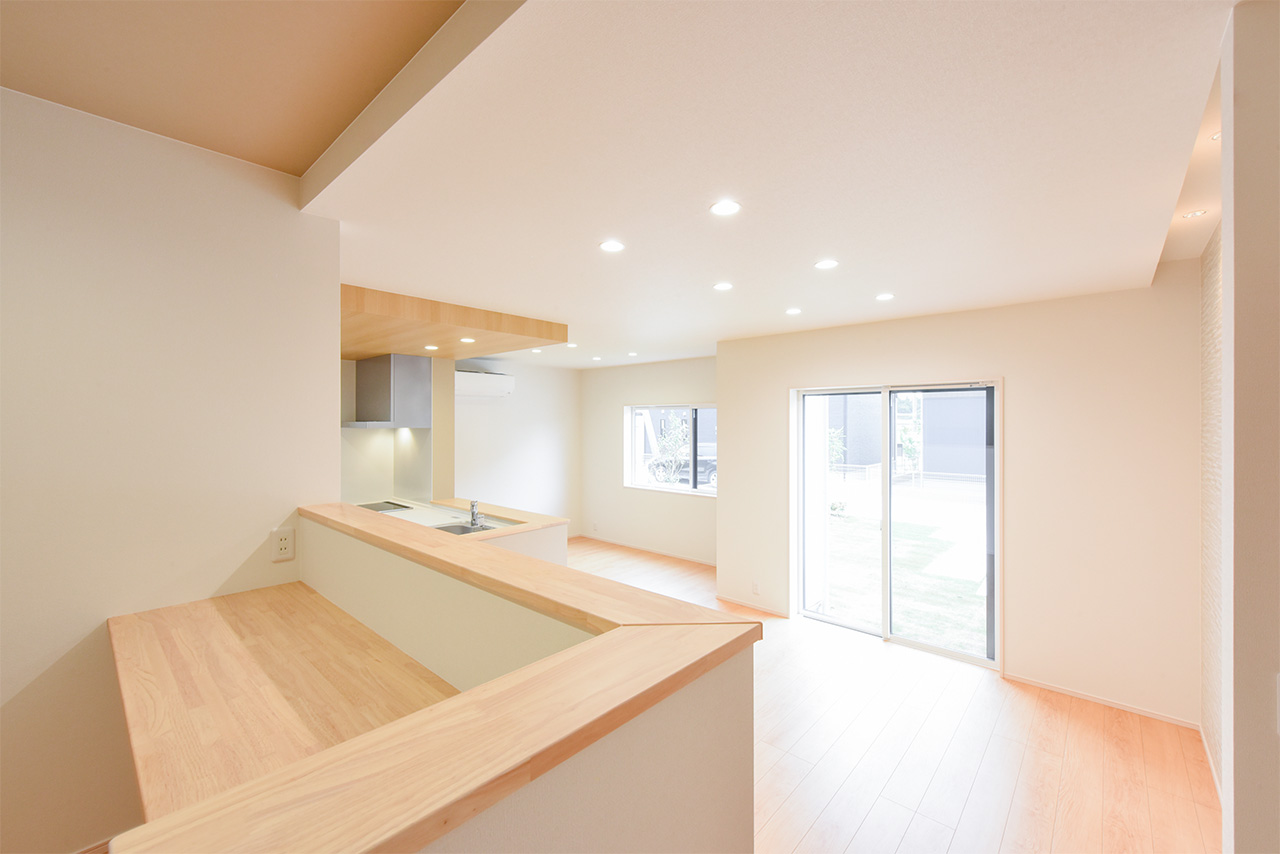 キッチンから洗面室・浴室までを最短距離で結んだ水回り動線設計。家事の移動距離を短縮するとともに、動線上には収納スペースなどをレイアウトし機能性も高めました。スマートな動線設計と時短設備が子育てにがんばるご家族をサポートします。