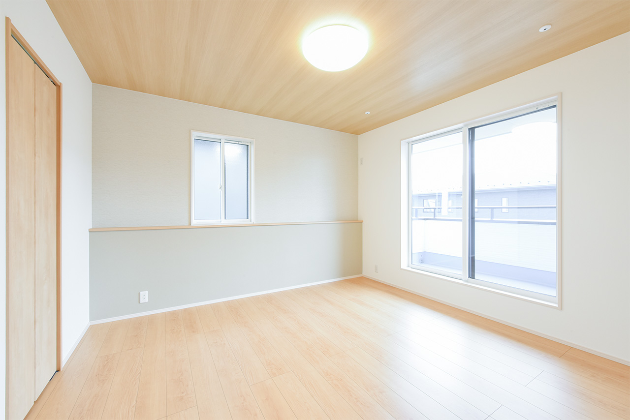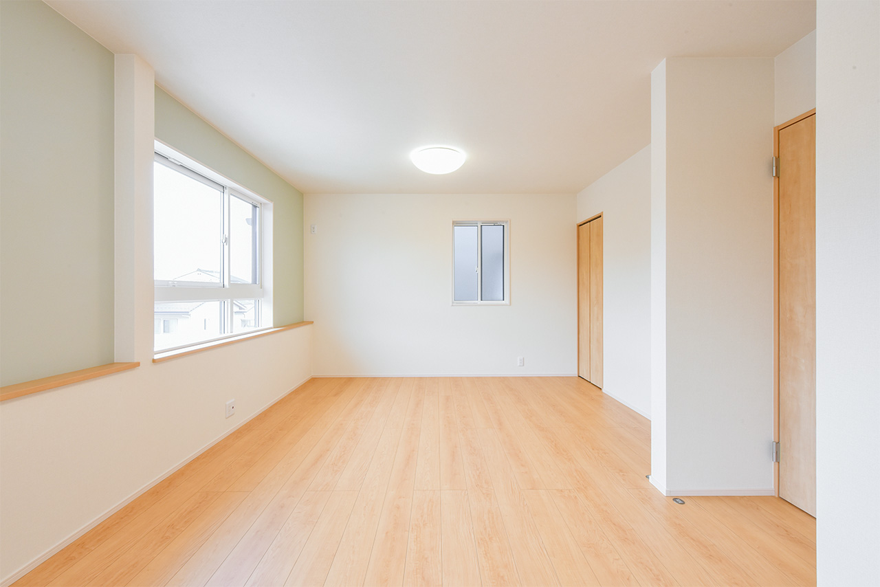 2つの空間に間仕切り可能な、広々とした2階2ドア1ルーム。子供が生まれる前、赤ちゃんが生まれてから、そして大きくなって個室を持つようになるまで対応。子ども達が独立したら広々としたご夫婦の書斎や趣味の部屋にも。ご家族の成長といっしょに変わっていく自由な家づくりが可能です。※間仕切り壁の設置は有料オプションとなります。