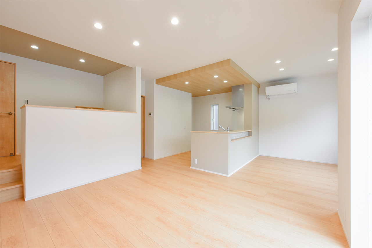 リビング階段の踊り場を利用したステージリビング。子どもが遊んだり、リビング学習をしたりと、リビングに子ども達の居場所を創るスペースです。もちろん、家族が自由に使えるスペースとして、様々なライフシーンを個性的に紡ぐアイデア空間です。