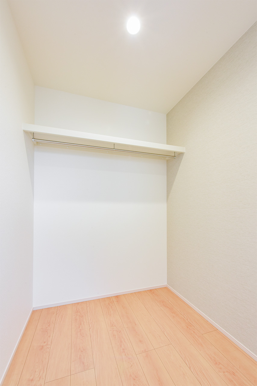ご夫婦や子ども達の衣類をたっぷりしまえる大容量のウォークインクローゼット。季節の衣類から鞄や帽子などの小物までたっぷり保管可能。ウォークインタイプなので衣類の出し入れや整理整頓もスムーズに行えます。