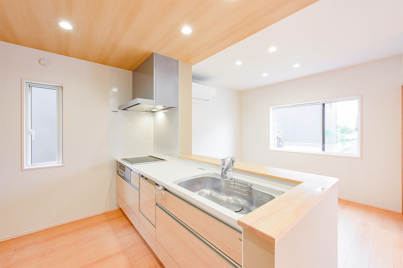 家族でのコミュニケーションがとれる対面型システムキッチン。横一列にシンクとコンロをまとめたシンプルな形です。動きやすさとスタイリッシュなデザインが魅力。