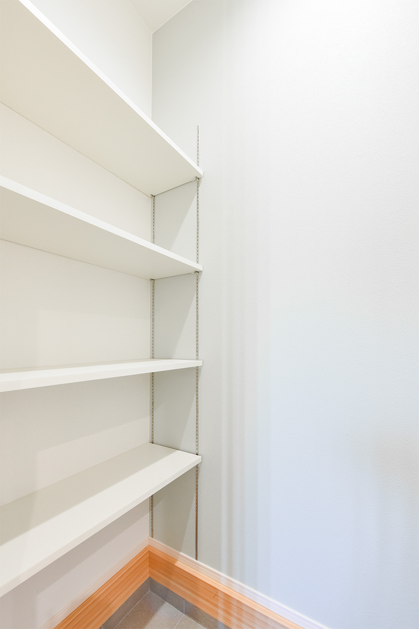 システムキッチンのすぐそばに配置したパントリー。ストック食品や調味料やお酒のほか、非常食や水のペットボトルなどの防災用品も収納できます。キッチンからすぐ手が届く場所にあるから、整理整頓もテキパキできて、キッチン空間をスッキリ保てます。