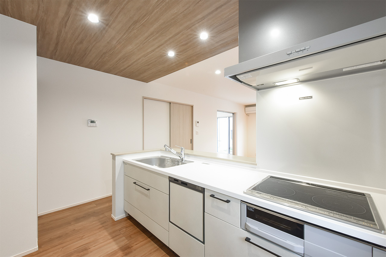 家族でのコミュニケーションがとれる対面型システムキッチン。横一列にシンクとコンロをまとめたシンプルな形です。動きやすさとスタイリッシュなデザインが魅力。