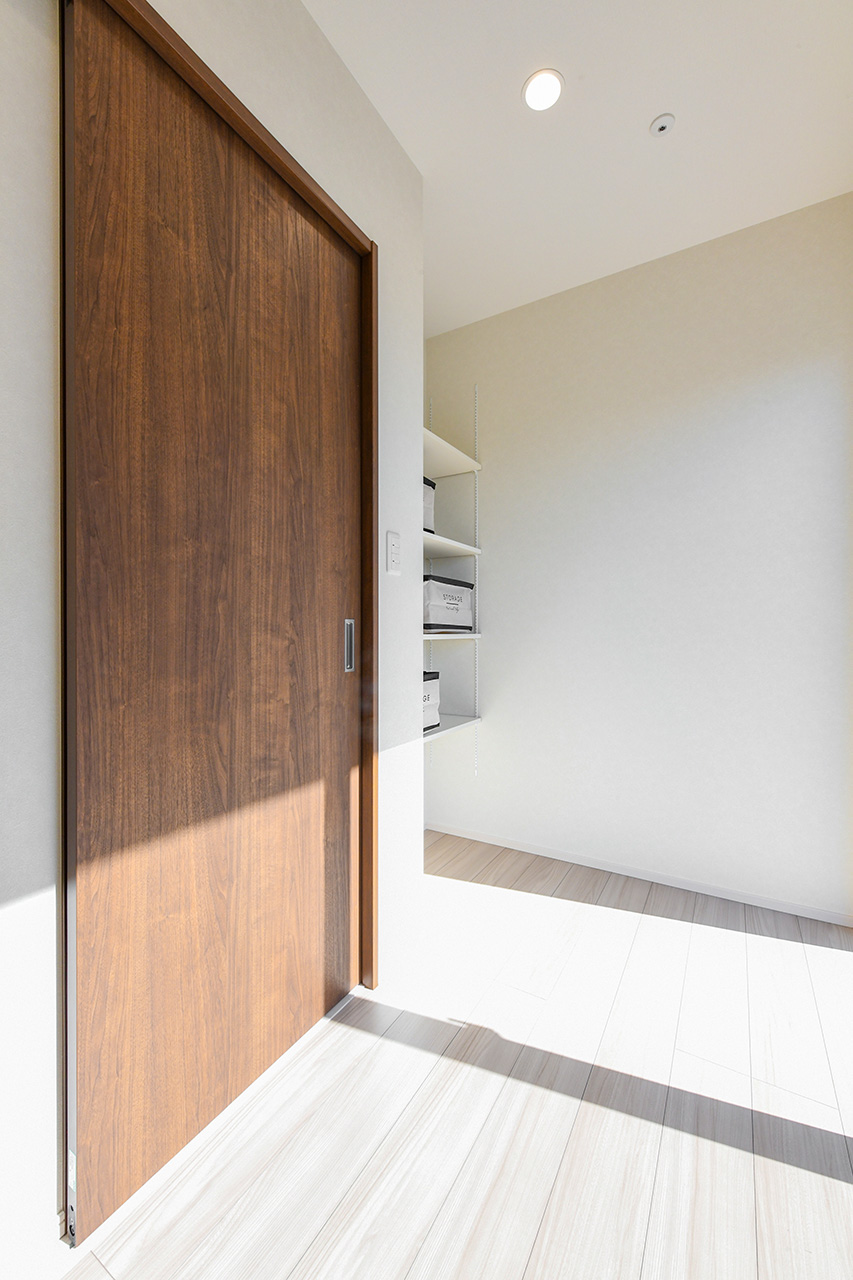 リビングそばに、家族がみんなが使いやすいたっぷり収納できるストレージをご用意。日用品や生活雑貨はもちろん、お子様のおもちゃなど、様々な収納に活用できます。日常の収納以外にも、来客時には、散らかった雑誌やおもちゃなども手早く片づける事ができます。