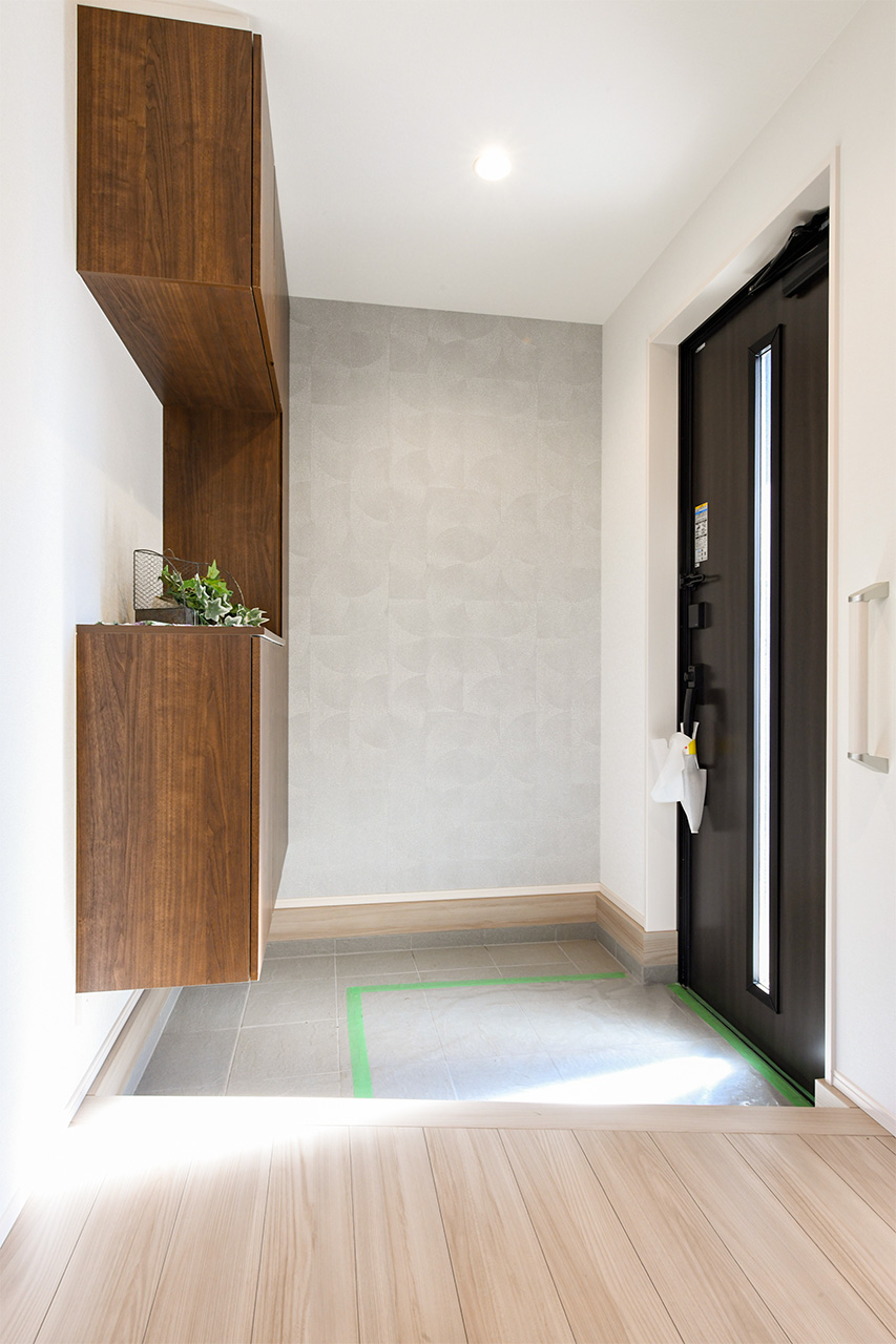 人の動きを感知して自動的に点灯する人感センサー付玄関照明を採用しました。ご家族の帰宅を明るく迎えるだけでなく、不意なライトの光が侵入者への警告になります。
