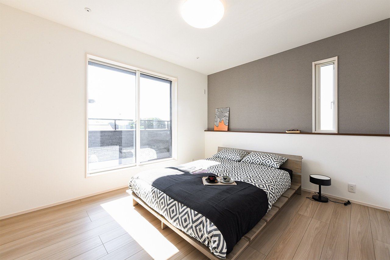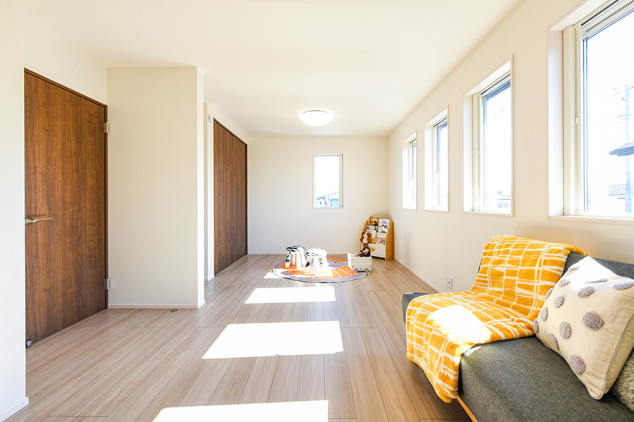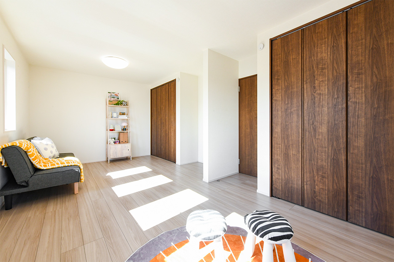 2つの空間に間仕切り可能な、広々とした2階2ドア1ルーム。子供が生まれる前、赤ちゃんが生まれてから、そして大きくなって個室を持つようになるまで対応。子ども達が独立したら広々としたご夫婦の書斎や趣味の部屋にも。ご家族の成長といっしょに変わっていく自由な家づくりが可能です。※間仕切り壁の設置は有料オプションとなります。
