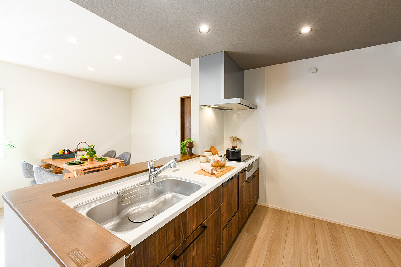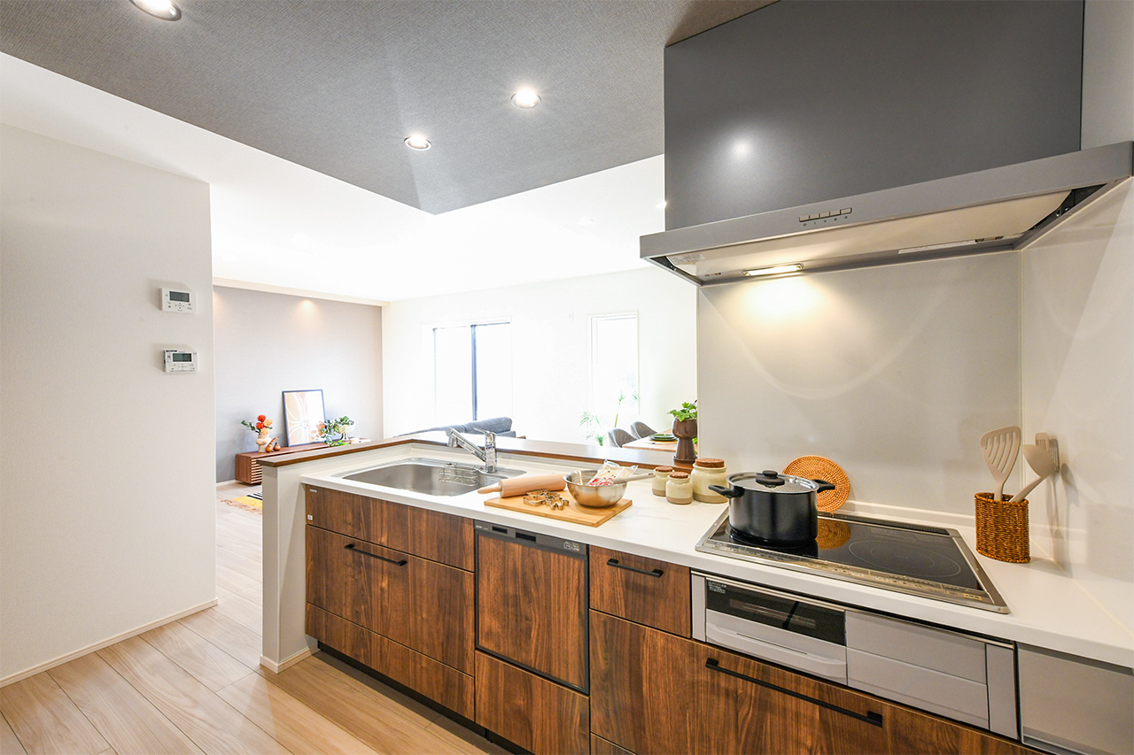 家族でのコミュニケーションがとれる対面型システムキッチン。横一列にシンクとコンロをまとめたシンプルな形です。動きやすさとスタイリッシュなデザインが魅力。