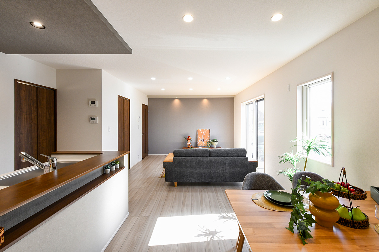 リビングという暮らしのメインスペースは、一日で家族が一番長く過ごす場所。その居心地をさらに高めるために18帖以上のワイドな広さを確保しました。広場のようなパブリックスペースがご家族の集いや団らんを心地よく育みます。