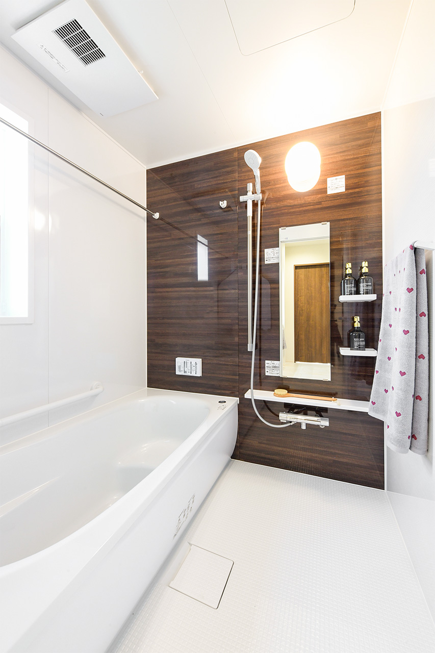 雨の日も気にせず洗濯物が浴室内に干せる浴室換気乾燥暖房機を標準装備。時間も天気も気にせず干せるからとても便利。また、浴室のジメジメした環境から発生するカビも抑えることができます。