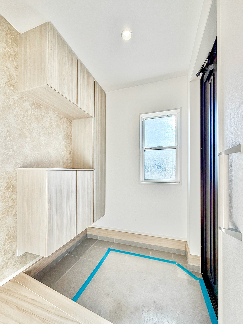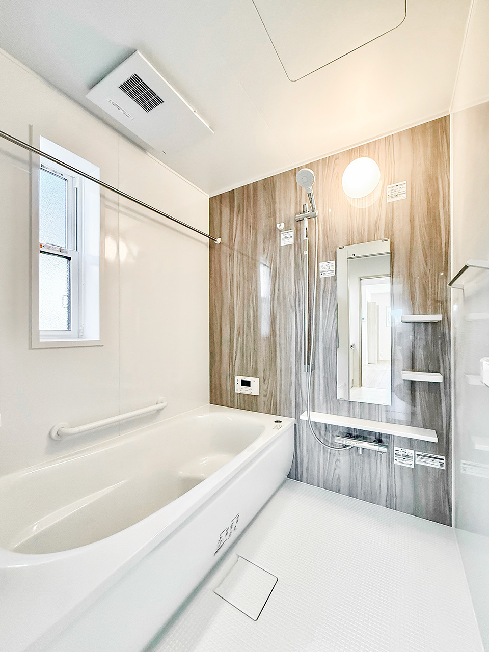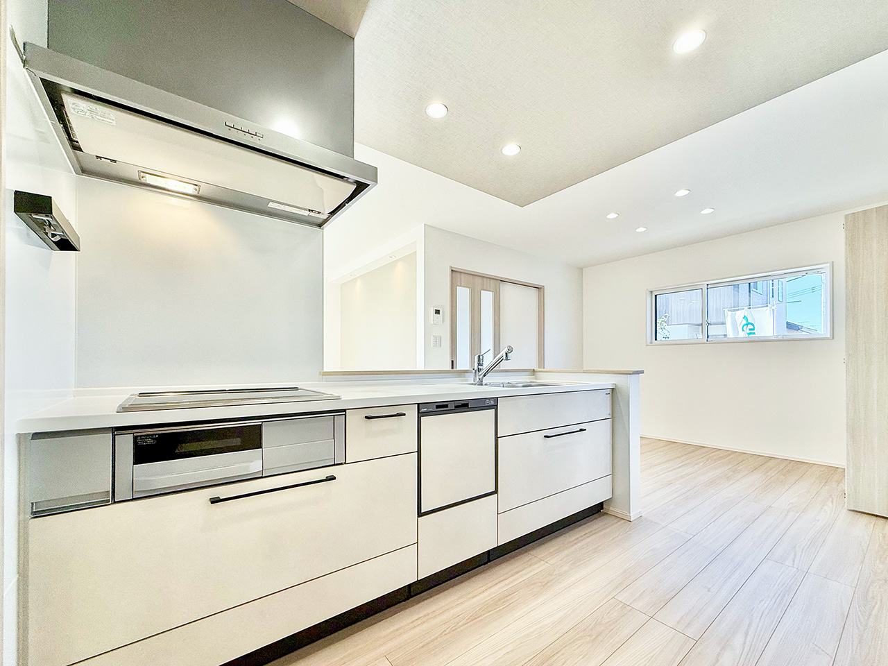 キッチンから洗面室・浴室までを最短距離で結んだ水回り動線設計。家事の移動距離を短縮するとともに、動線上には収納スペースなどをレイアウトし機能性も高めました。スマートな動線設計と時短設備が子育てにがんばるご家族をサポートします。