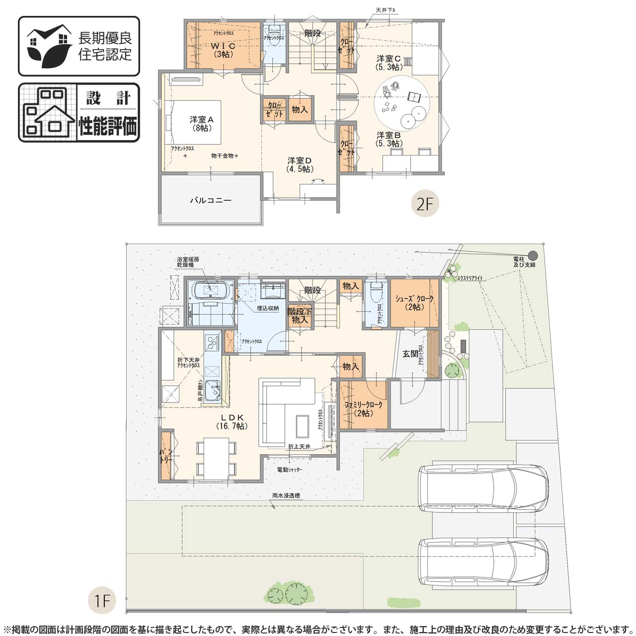 1階・2階のホールやリビングのそばに、用途やライフスタイルに合わせて自由にお使いいただける大容量の収納スペースをご用意しました。季節の衣類から鞄などの小物まで、たっぷりまとめて収納できます。