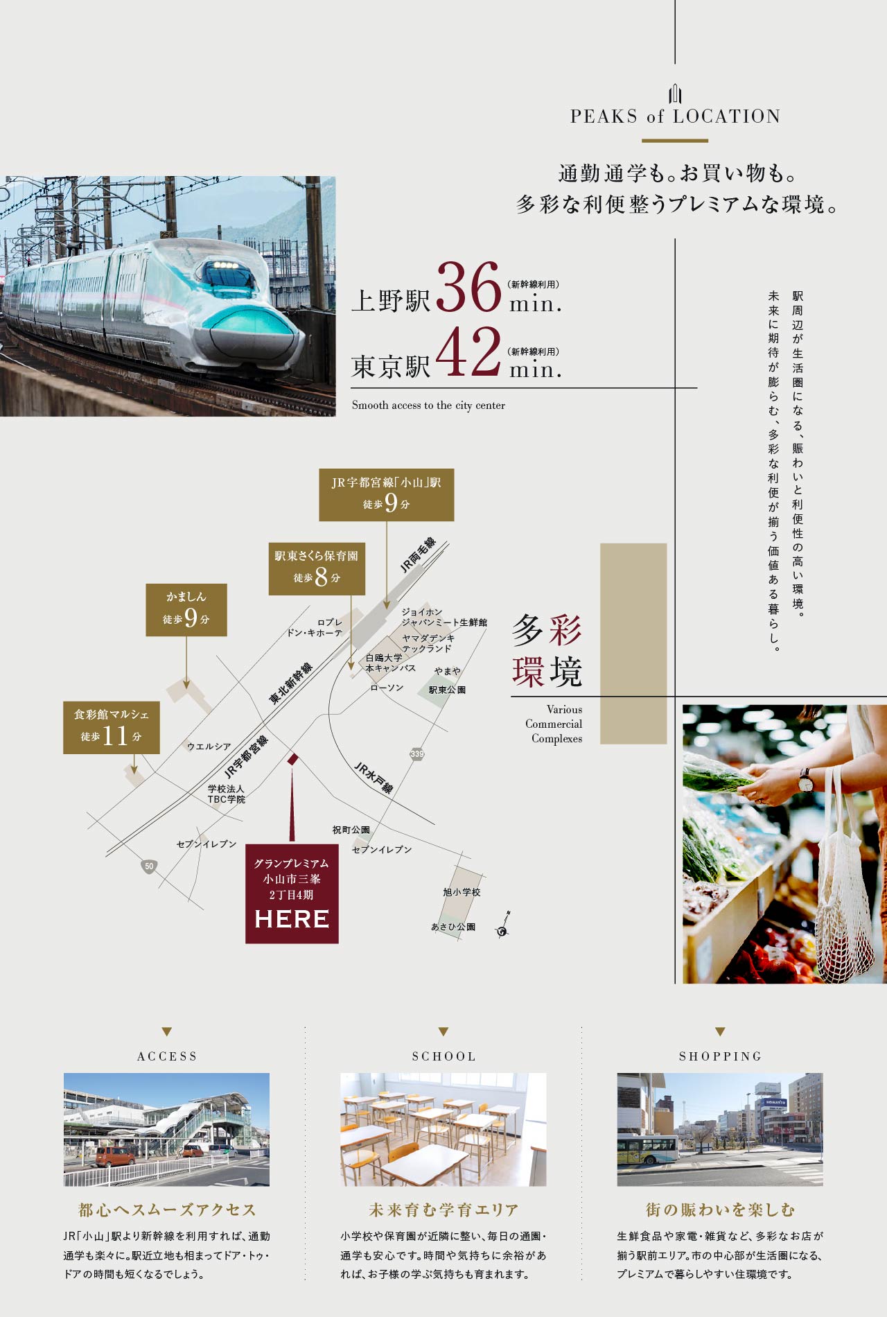 JR東北本線(宇都宮線)・JR両毛線・JR水戸線・JR東北新幹線|小山駅 約3,040m 〜 約3,090m 小山市コミュニティバス|せきぐち電機前停留所 徒歩 4分( 約260m ) 〜 徒歩 4分( 約310m ) |