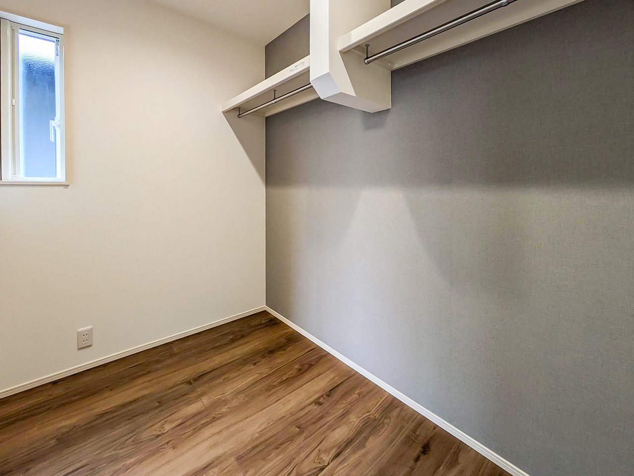 ウォークインクローゼット ご夫婦や子ども達の衣類をたっぷりしまえる大容量のウォークインクローゼット。季節の衣類から鞄や帽子などの小物までたっぷり保管可能。ウォークインタイプなので衣類の出し入れや整理整頓もスムーズに行えます。