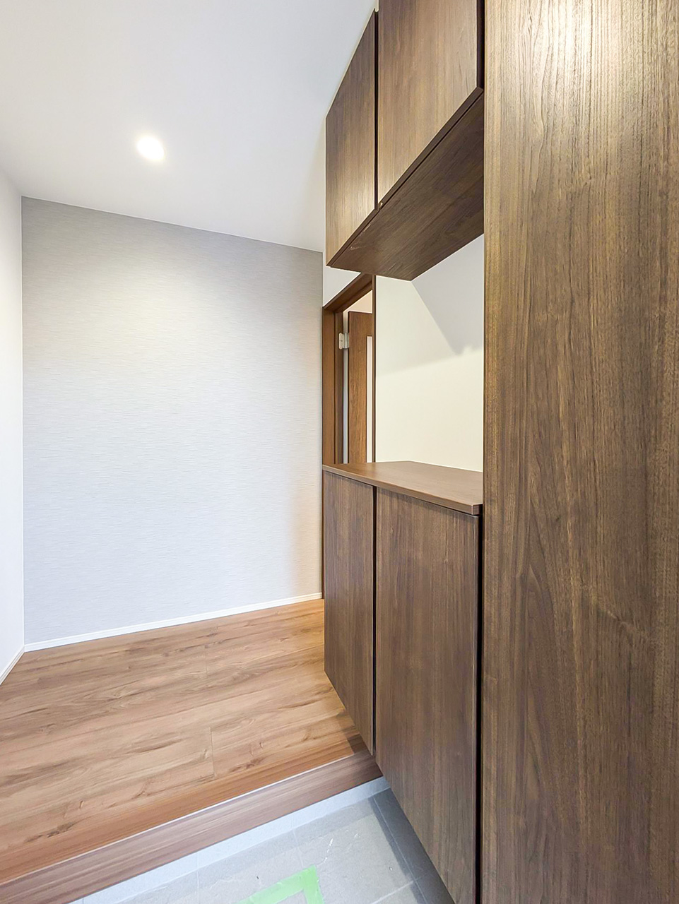 人感センサー付玄関照明 人の動きを感知して自動的に点灯する人感センサー付玄関照明を採用しました。ご家族の帰宅を明るく迎えるだけでなく、不意なライトの光が侵入者への警告になります。