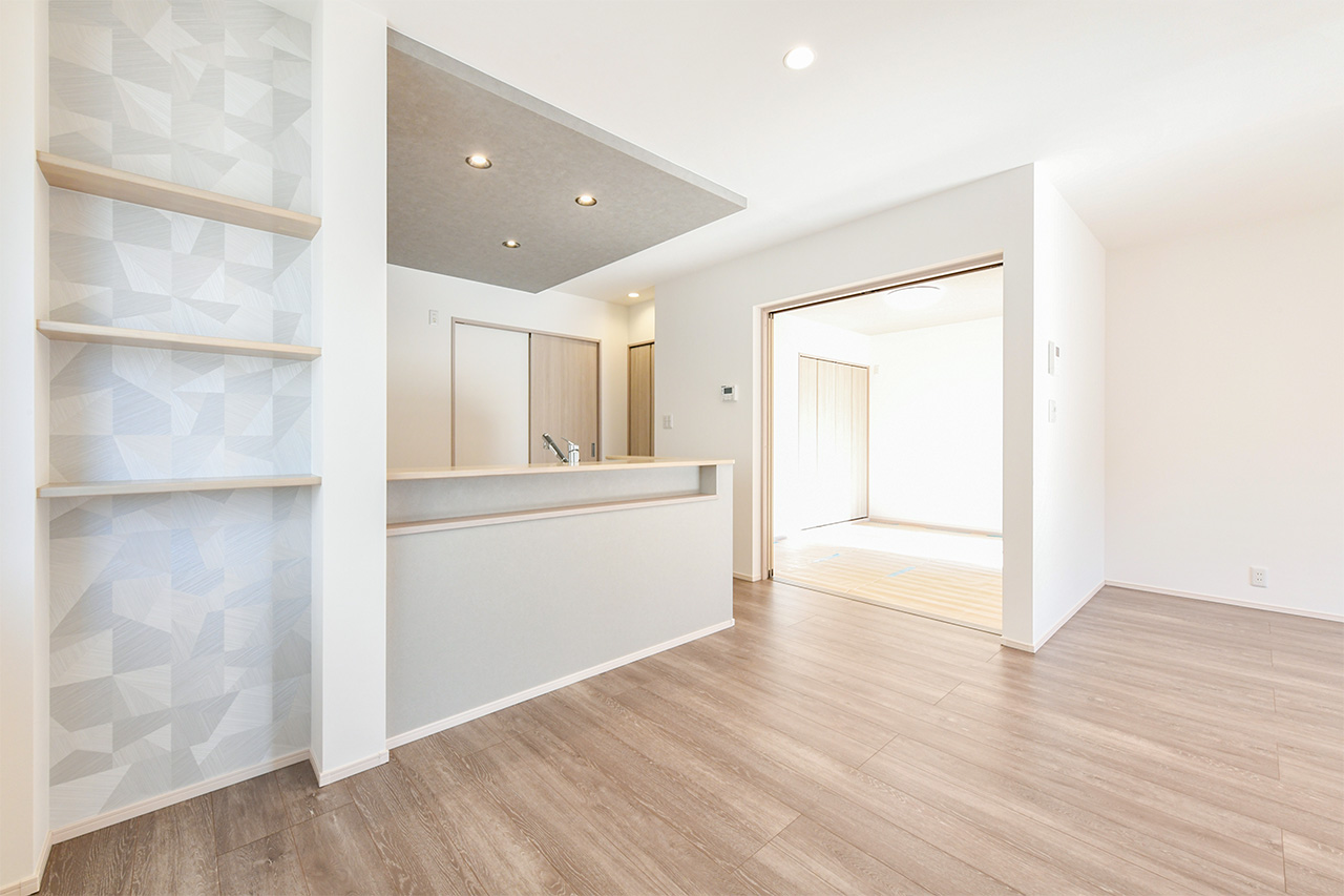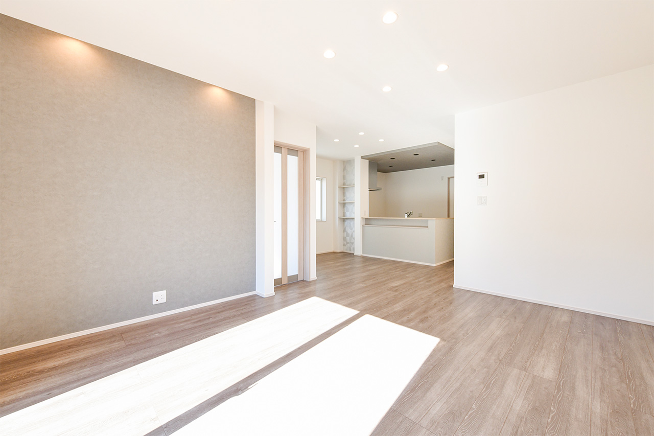 リビングという暮らしのメインスペースは、一日で家族が一番長く過ごす場所。その居心地をさらに高めるために18帖以上のワイドな広さを確保しました。広場のようなパブリックスペースがご家族の集いや団らんを心地よく育みます。