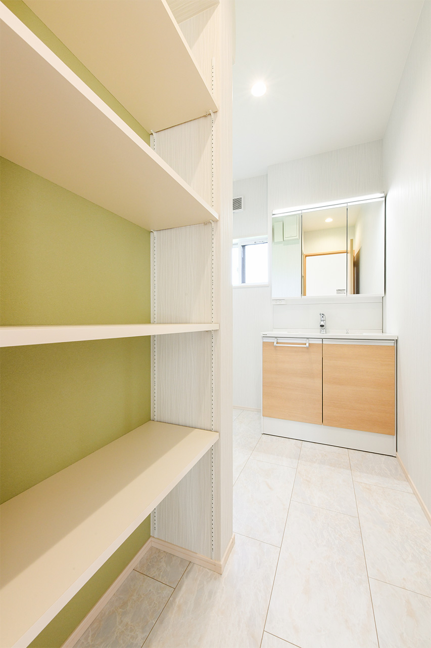 システムキッチンのすぐそばに配置したパントリー。ストック食品や調味料やお酒のほか、非常食や水のペットボトルなどの防災用品も収納できます。キッチンからすぐ手が届く場所にあるから、整理整頓もテキパキできて、キッチン空間をスッキリ保てます。