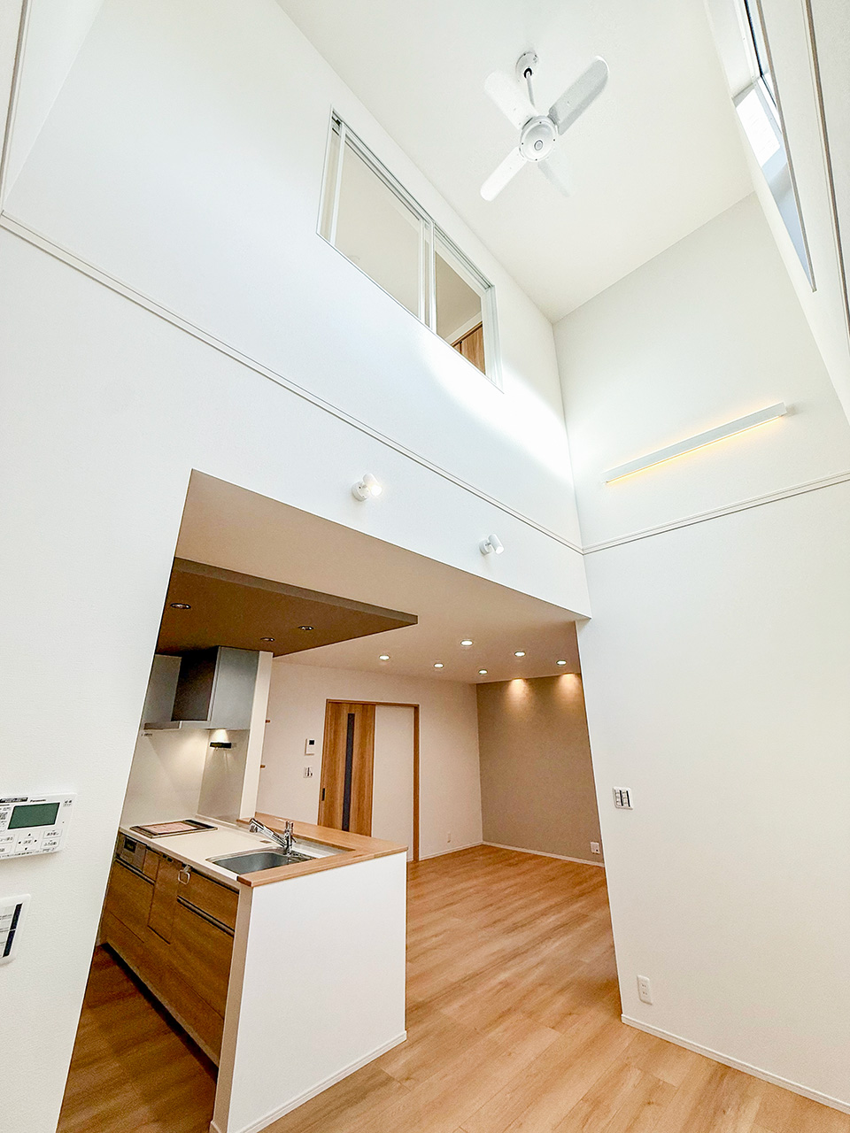 ご家族の団らんや寛ぎの中心となるリビング空間をさらに際立たせる吹抜け天井プラン。2階天井まで続くその圧倒的な存在感と広がりが訪れた方を驚きを持ってお迎えします。大切にしたいご家族やゲストをもてなす上質な空間です。