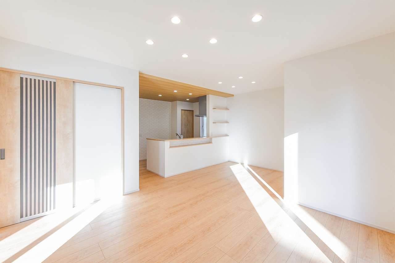 閉じる 2階フレキシブル 2つの空間に間仕切り可能な、広々とした2階2ドア1ルーム。子供が生まれる前、赤ちゃんが生まれてから、そして大きくなって個室を持つようになるまで対応。子ども達が独立したら広々としたご夫婦の書斎や趣味の部屋にも。ご家族の成長といっしょに変わっていく自由な家づくりが可能です。※間仕切り壁の設置は有料オプションとなります。