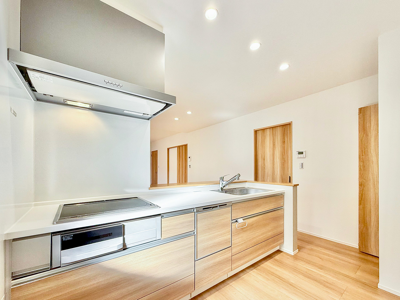 システムキッチンのすぐそばに配置したパントリー。ストック食品や調味料やお酒のほか、非常食や水のペットボトルなどの防災用品も収納できます。キッチンからすぐ手が届く場所にあるから、整理整頓もテキパキできて、キッチン空間をスッキリ保てます。