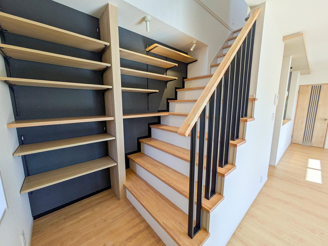 開放的なリビング階段のそばに設けたギャラリーとヌックが住まいをライブラリに