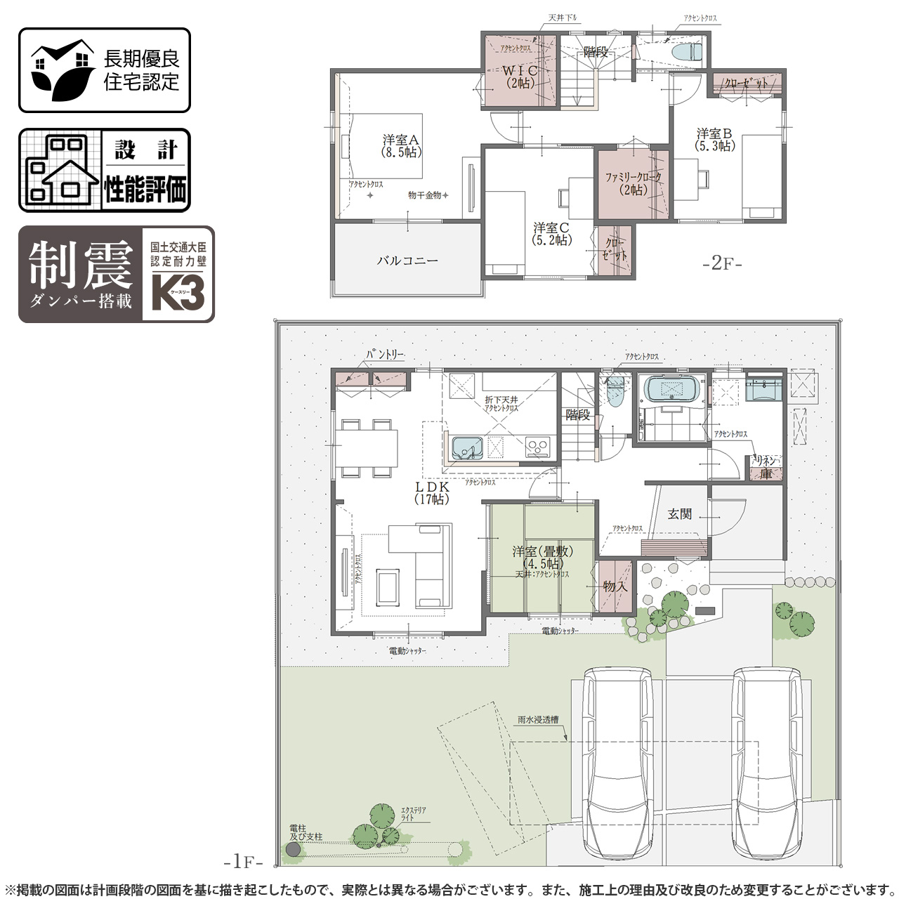 ※掲載の図面は計画段階の図面を基に描き起こしたもので、実際とは異なる場合がございます。また、施工上の理由及び改良のため変更することがございます。建売分譲住宅