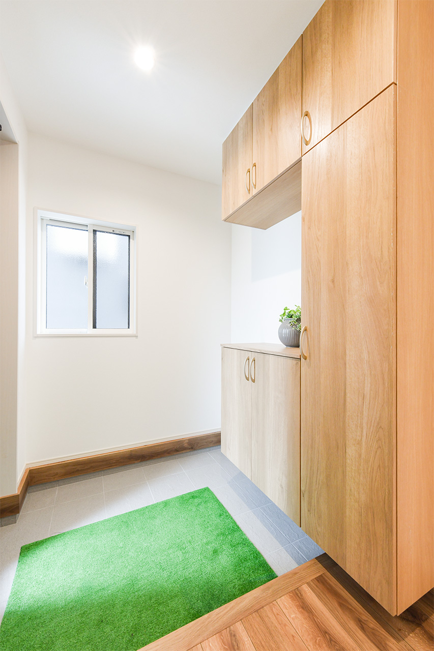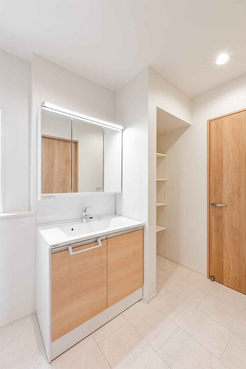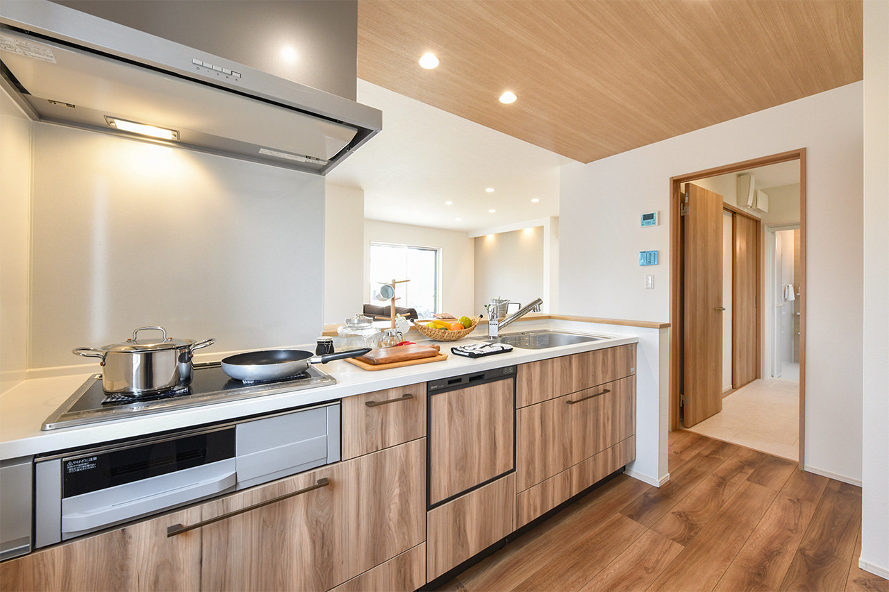 キッチンから洗面室・浴室までを最短距離で結んだ水回り動線設計。家事の移動距離を短縮するとともに、動線上には収納スペースなどをレイアウトし機能性も高めました。スマートな動線設計と時短設備が子育てにがんばるご家族をサポートします。