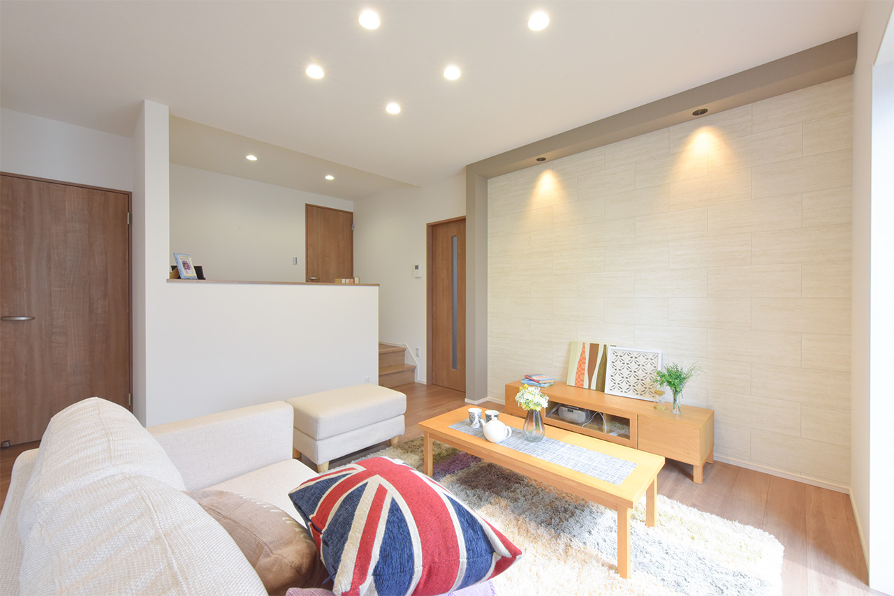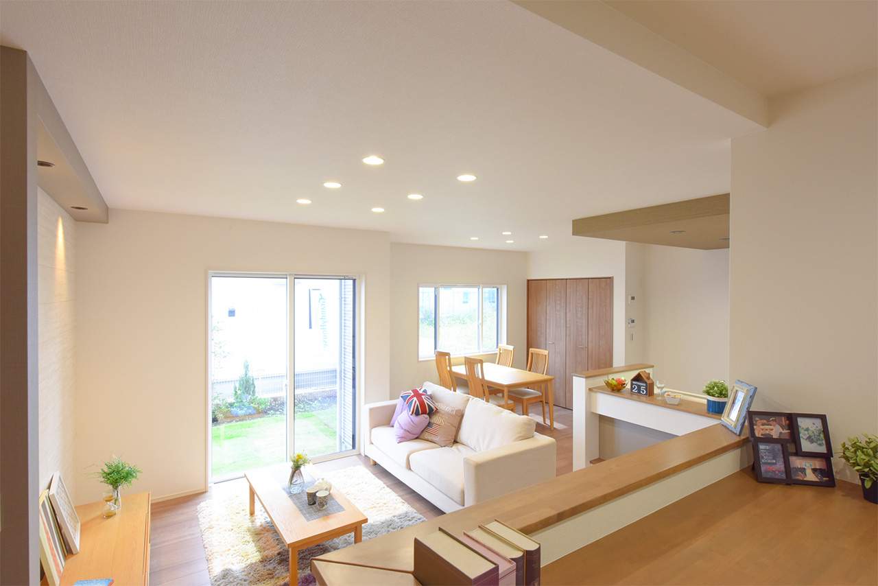 リビング階段の踊り場を利用したステージリビング。子どもが遊んだり、リビング学習をしたりと、リビングに子ども達の居場所を創るスペースです。もちろん、家族が自由に使えるスペースとして、様々なライフシーンを個性的に紡ぐアイデア空間です。