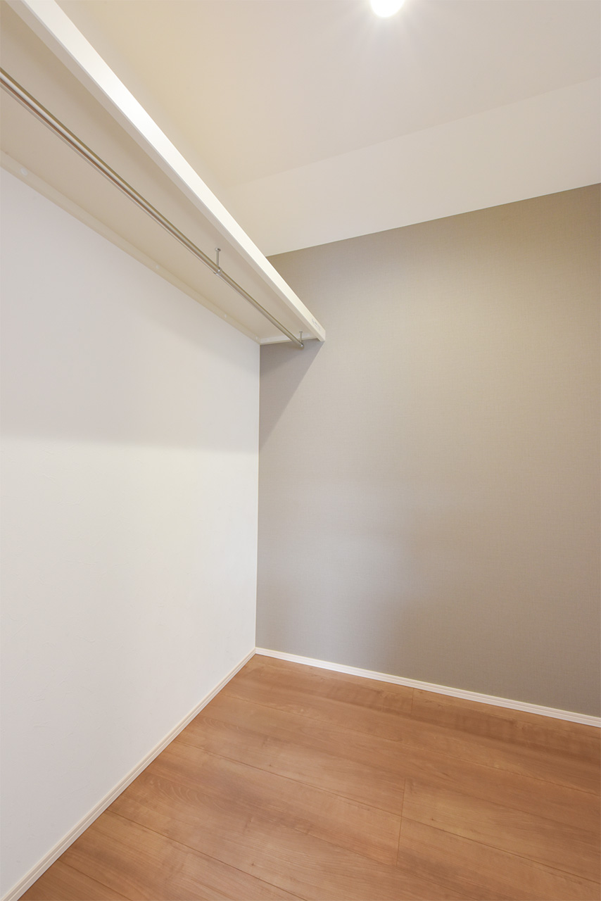 ご夫婦や子ども達の衣類をたっぷりしまえる大容量のウォークインクローゼット。季節の衣類から鞄や帽子などの小物までたっぷり保管可能。ウォークインタイプなので衣類の出し入れや整理整頓もスムーズに行えます。