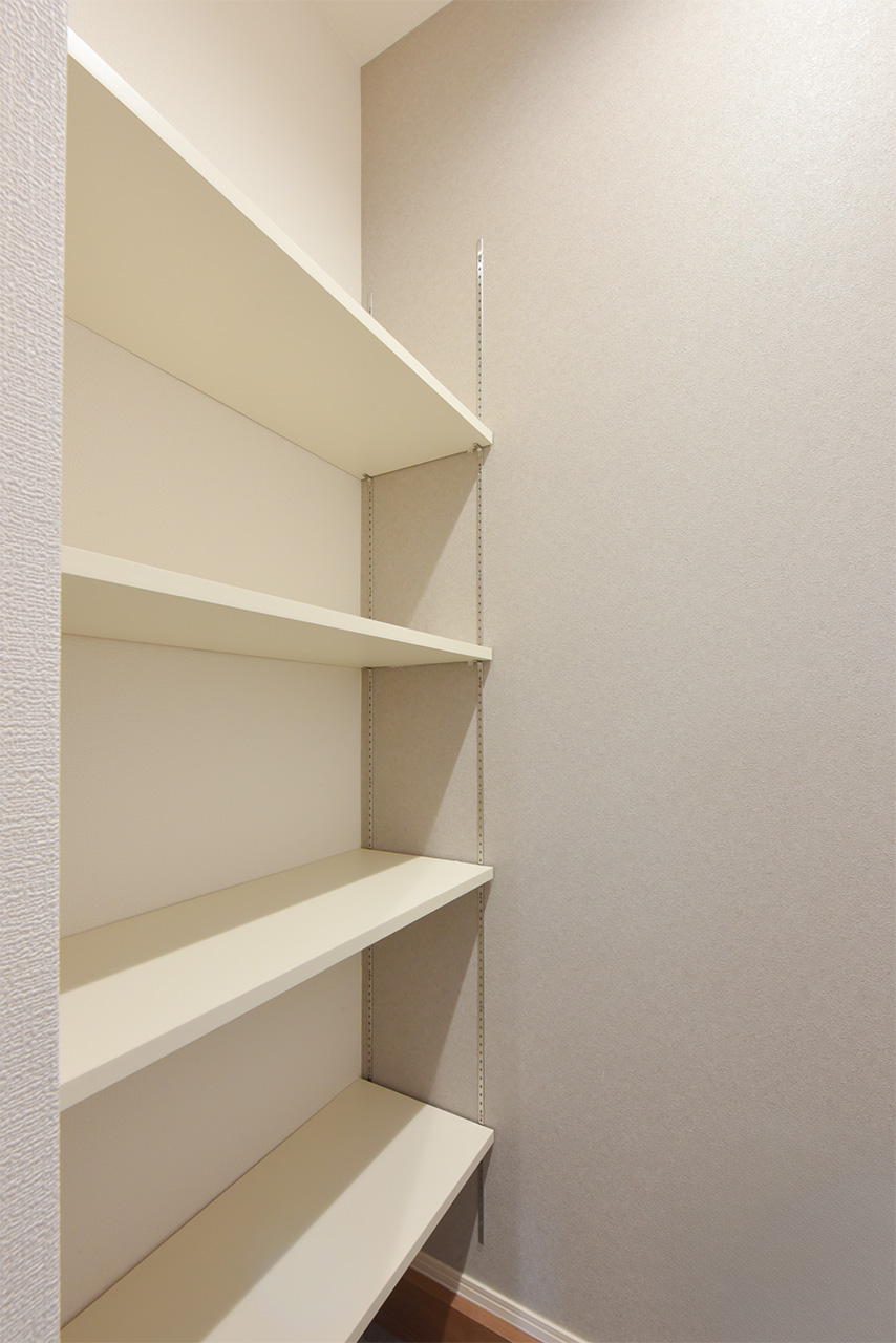 システムキッチンのすぐそばに配置したパントリー。ストック食品や調味料やお酒のほか、非常食や水のペットボトルなどの防災用品も収納できます。キッチンからすぐ手が届く場所にあるから、整理整頓もテキパキできて、キッチン空間をスッキリ保てます。
